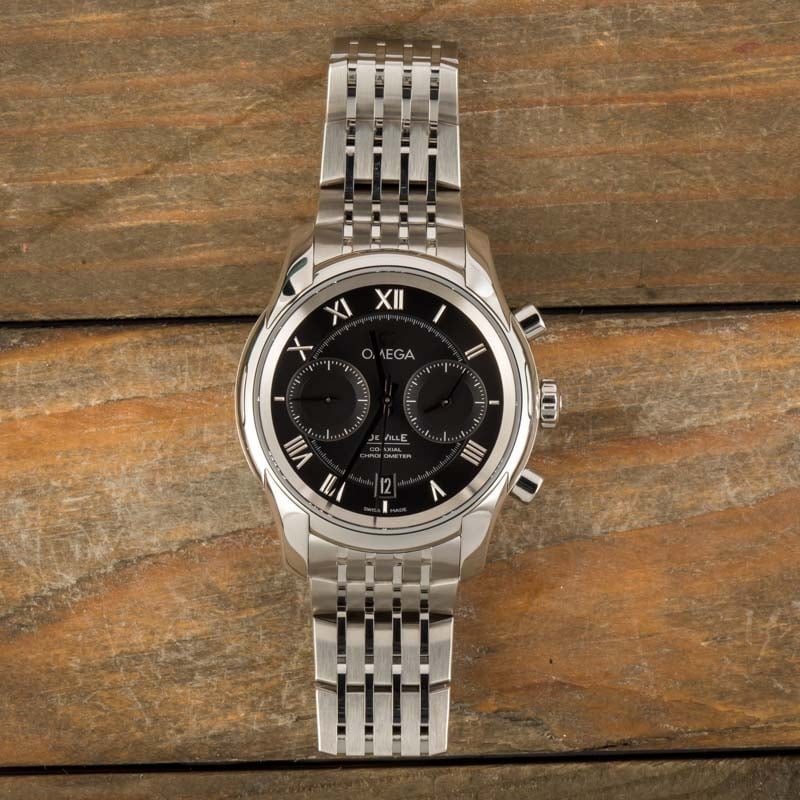 The Hour Vision De Ville Omega Chronograph has everything the discerning watch collector seeks in a versatile Swiss-made luxury watch, including a timeless stainless steel finish, a sharp black dial decorated with a legible display, and a durable waterproof case. Ref. 431.10.42.51.01.001 also sports a scratch-resistant sapphire crystal and a multi-link bracelet with a butterfly clasp for added security. The two-zone dial displays faceted Roman numeral hour markers around the outside of the dial and features hands and twin registers at the center. Omega furnishes this edition of the famous De Ville with the celebrated caliber 9300 Co-Axial movement with self-winding technology and a 60-hour power reserve.
