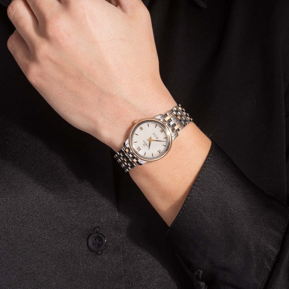 Pre-owned/unworn Ladies Omega De Ville ref 424.20.27.60.05.002 in steel and red gold is a timeless stunner. It boasts the luxury of precious metal while bringing an irresistible level of versatility to the series and an affordable price point. If you’ve always wanted to invest in a coveted gold Omega but don’t have the budget for a full-gold watch, this women’s model is the watch to buy. Features include a gorgeous two-zone white Mother-of-Pearl dial decorated with gold baton and Roman numeral-style hour markers and long, tapered hands. Additionally, the 27.4mm case will flatter near any wrist, and the quartz caliber 1376 movement promises uncompromising accuracy for up to 48 months.