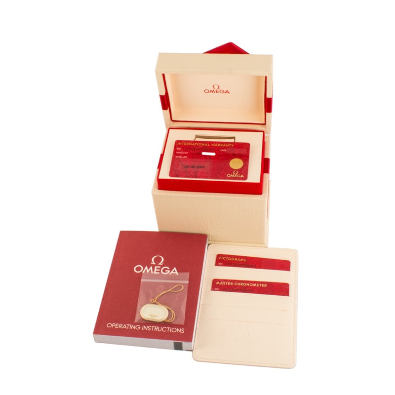 Pre-owned Omega Seamaster Aqua Terra ref 220.13.38.20.09.001 (2022) is a lovely, unisex edition of the famous maritime watch. The 38mm model displays the time on a unique crystal linen dial, which we don’t see here often at Bob’s Watches. The hands and oval indices, which are modeled after the hull of a sailboat, are dressed in 18K Sedna? gold hands and filled with Super-LumiNova. The hour markers also feature a gorgeous Mother-of-Pearl inlay for subtle shimmer. The 18K Sedna? gold ring complements the beautiful lines of the hour markers and hands and houses the calendar display above the 6-hour marker. Exquisite design elements aside, the Omega 220.13.38.20.09.001 is an Aqua Terra watch, through and through. It offers water resistance up to 150 meters and is powered by a Master Chronometer caliber 8802 self-winding mechanical movement with a 55-hour power reserve and anti-magnetism up to 15,000 gauss.