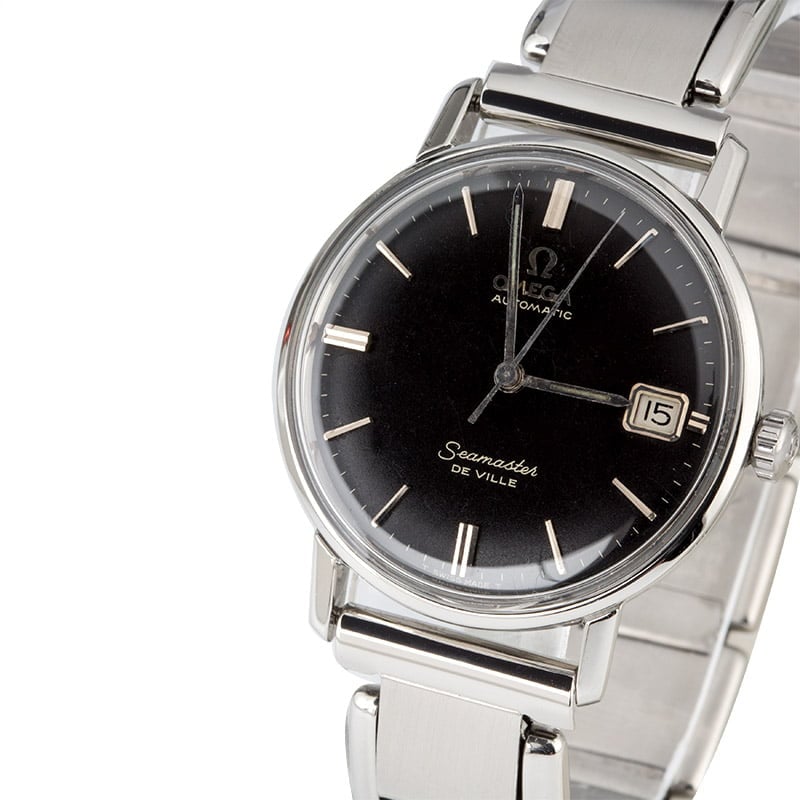 The 1960’s era Omega Seamaster Deville is classic and easy to wear. The case is modest, measuring 34mm and features a smooth bezel, Plexiglas crystal, straight lugs, and a contrasting black dial. Elegant hour markers and hands top the dial as well as a date window at the 3-hour marker. The case is worn on a matching stainless steel bracelet for a sleek and masculine hold. A calibre 552 automatic movement beats within the case to ensure many more years of reliable readings. If it’s a subtle vintage timepiece that you seek, then the Omega Seamaster Deville may be the perfect watch for your wrist.