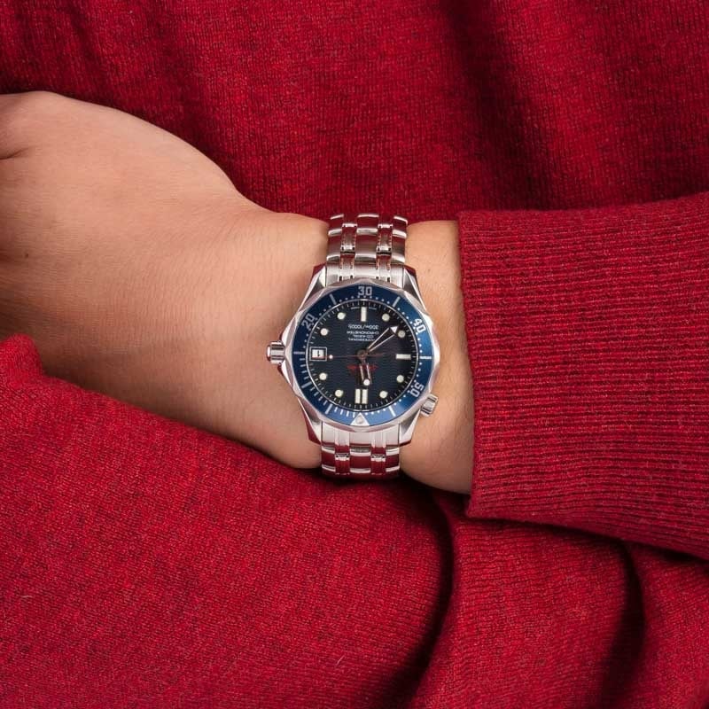 Pre-owned Omega Seamaster Diver 300M ref 2222.80.00. While numerous variations of the mens Omega Seamaster Diver 300M are currently available on the pre-owned market, none is as iconic and recognizable as the blue wave dial example you see here today. Daniel Craig famously wore a similar variation of reference 2222.80.00 during his 2006 portrayal of James Bond in 2006’s Casino Royale. While the Omega watch for sale here does not come with extra Q Branch gadgetry, it’s still just as coveted by avid collectors. It also boasts a bevy of modern amenities, including a blue uni-directional 60-minute diver’s bezel, a Helium Escape Valve, water resistance up to 300 meters. and a Co-Axial cal. 2500 self-winding movement.