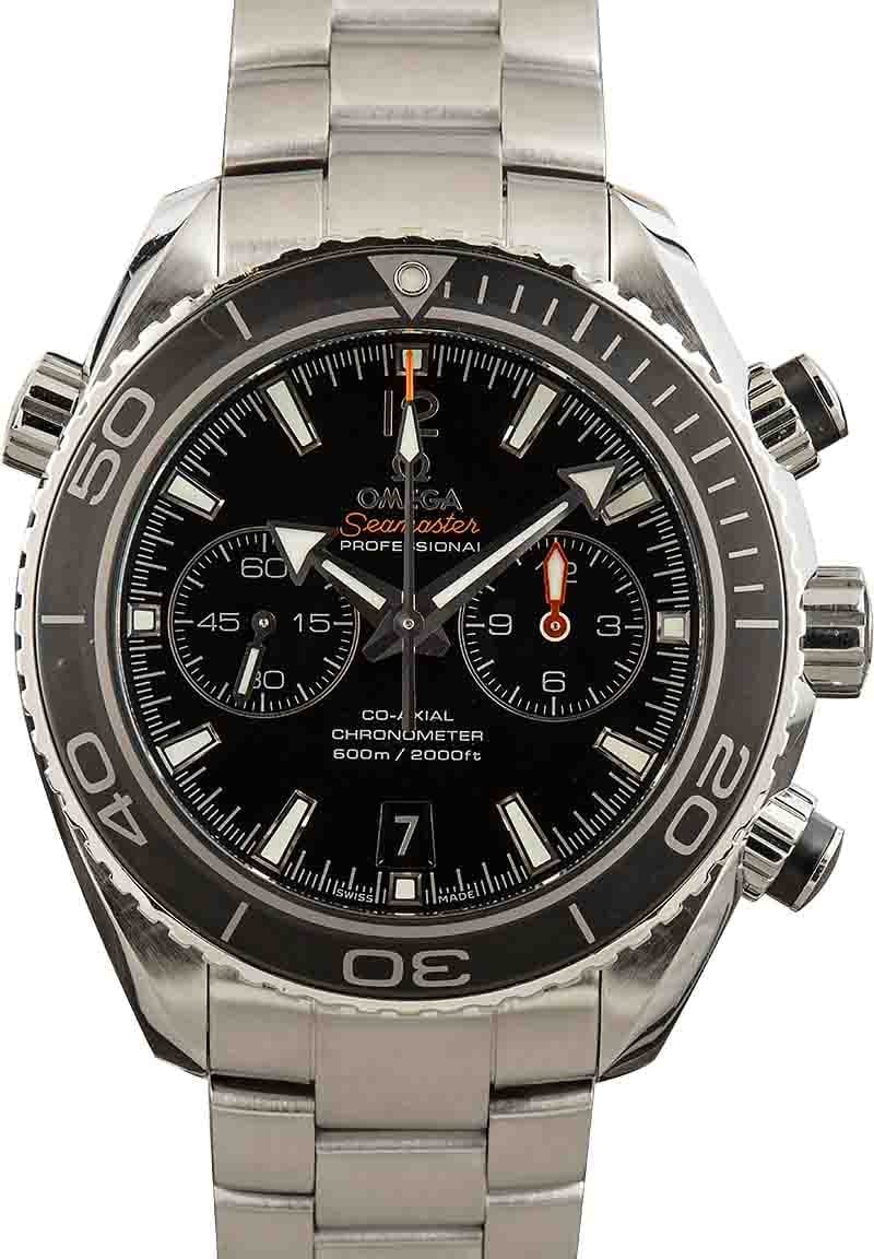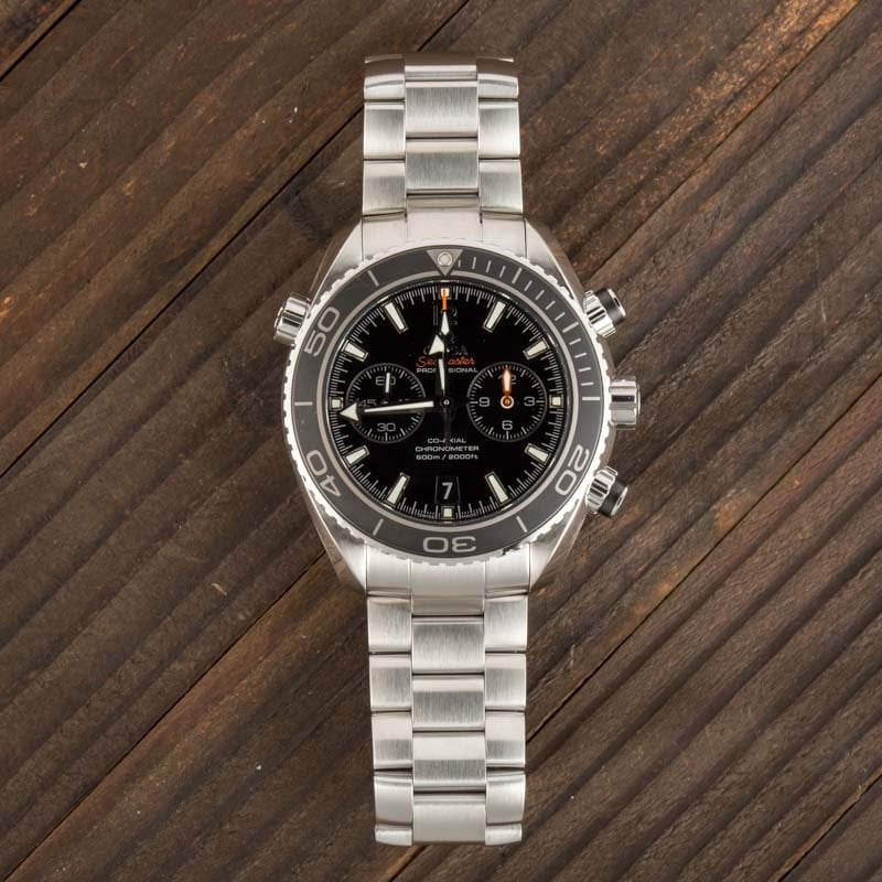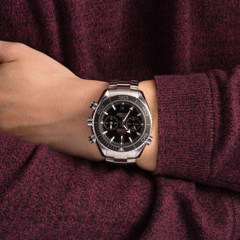 Pre-owned Omega Seamaster Planet Ocean ref 232.30.46.51.01.001 (2015). Omega released the Seamaster Planet Ocean in the 1950s. Decades later, it has evolved into a sophisticated and purpose-driven luxury watch with immense wrist presence. While many iterations of the deep saturation dive watch exist on the secondary market, none is as iconic as the stainless steel edition with a black dial and bezel. Pre-owned ref. 232.30.46.51.01.001 is a contemporary example of the collection, featuring a next-generation Master Chronometer caliber 9300 automatic movement, scratch-resistant sapphire, a durable black ceramic unidirectional bezel, and a lustrous black ceramic dial. The chronograph pushers feature black tubes to match the rest of the sporty aesthetic of the watch. Ref. 232.30.46.51.01.001 is a chronograph Planet Ocean, complete twin registers displaying small seconds and chronograph minutes and hours.