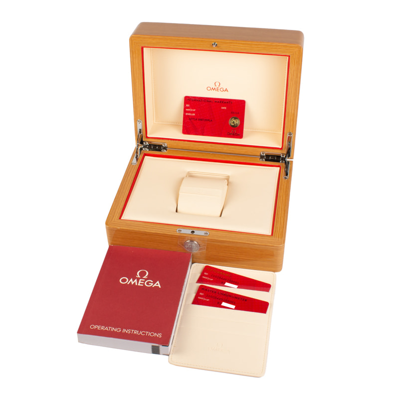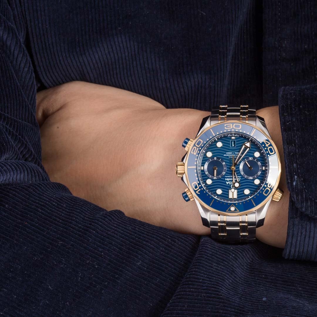Pre-owned Omega Seamaster Pro 300M ref 210.20.44.51.03.001 in steel and yellow gold is a stunning edition of the famous dive watch. The two-tone finish is paired with a lustrous polished blue ceramic bezel insert decorated with a luxurious Ceragold? diving scale, matching blue ceramic pushers, and a matching blue dial adorned with crisp, laser-engraved waves, the date at 6 o’clock, and 18k yellow gold hour markers and hands filled with Super-LumiNova. The case offers water resistance up to 300 meters – perfect for any multi-faceted lifestyle. Ref. 210.20.44.51.03.001 also features the celebrated Master Chronometer caliber 9900 self-winding movement with substantial anti-magnetism and a 60-hour power reserve.