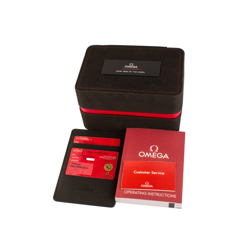 Pre-owned Omega Speedmaster ref 311.92.44.30.01.002 (2022) Dark Side of the Moon marries the distinct design elements of the Speedmaster Racing, Moon Watch, and Alinghi partnership onto one incredible wristwatch. The all-black design set is reminiscent of the far side of the Moon blanketed in darkness, featuring a black ceramic case, black rubber strap, and a black skeletonized dial. Ref. 311.92.44.30.01.002 also sports many typical Omega racing design elements, such as the checkered minute track, carbon fiber dial, and sporty red accents. Last but certainly not least is the watch’s Alinghi connection, which Omega has cleverly incorporated with a red Alinghi logo on the start/stop pusher and in the register at 6 o’clock. Additionally, the exposed parts of the movement visible through the skeleton dial are modeled after the hull of the ALINGHI TF35 catamaran.