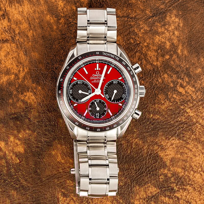 Omega is a prestigious luxury watch brand known for its innovative designs, reliable movements, and timeless styling. Within the collection is the Speedmaster chronograph, which is also known as the Moonwatch, a name it earned after becoming the first watch on the Moon. The ref. 326.30.40.50.11.001 is a unique Racing edition of the Speedmaster that is distinguished by a remarkable red dial adorned with black ?Clous de Paris? sub-dials and lumed hour markers and hands. The Tachymeter bezel mirrors the striking aesthetic of the dial with matching red accents. The Racing collection was launched in 2012 and included a series of colorful dials inspired by motorsport. It is no longer in production. Don’t miss out on the chance to add this discontinued Omega to your watch box today.