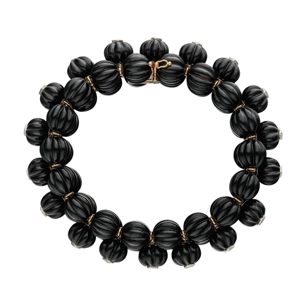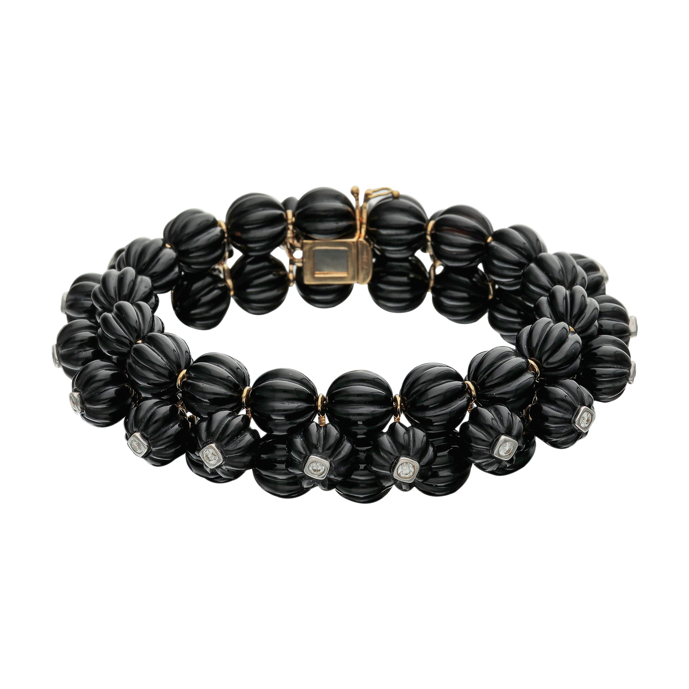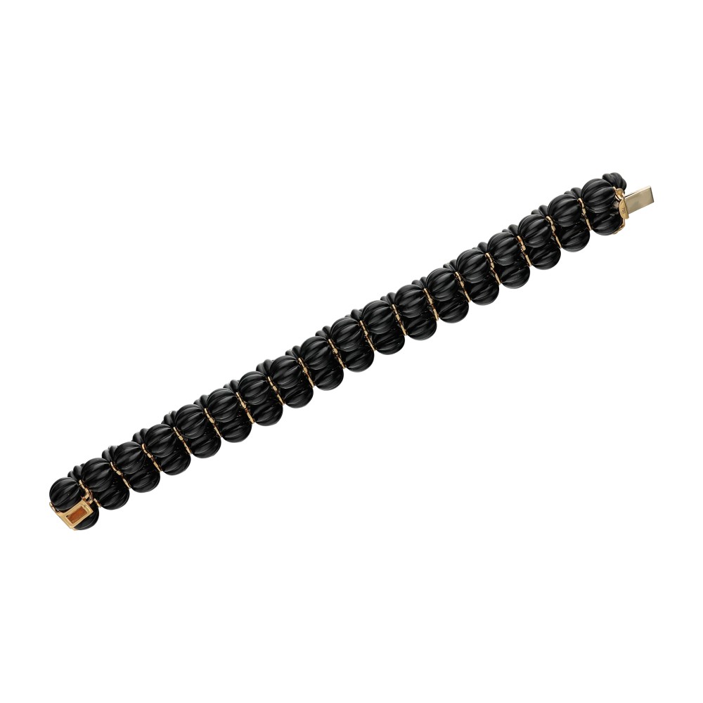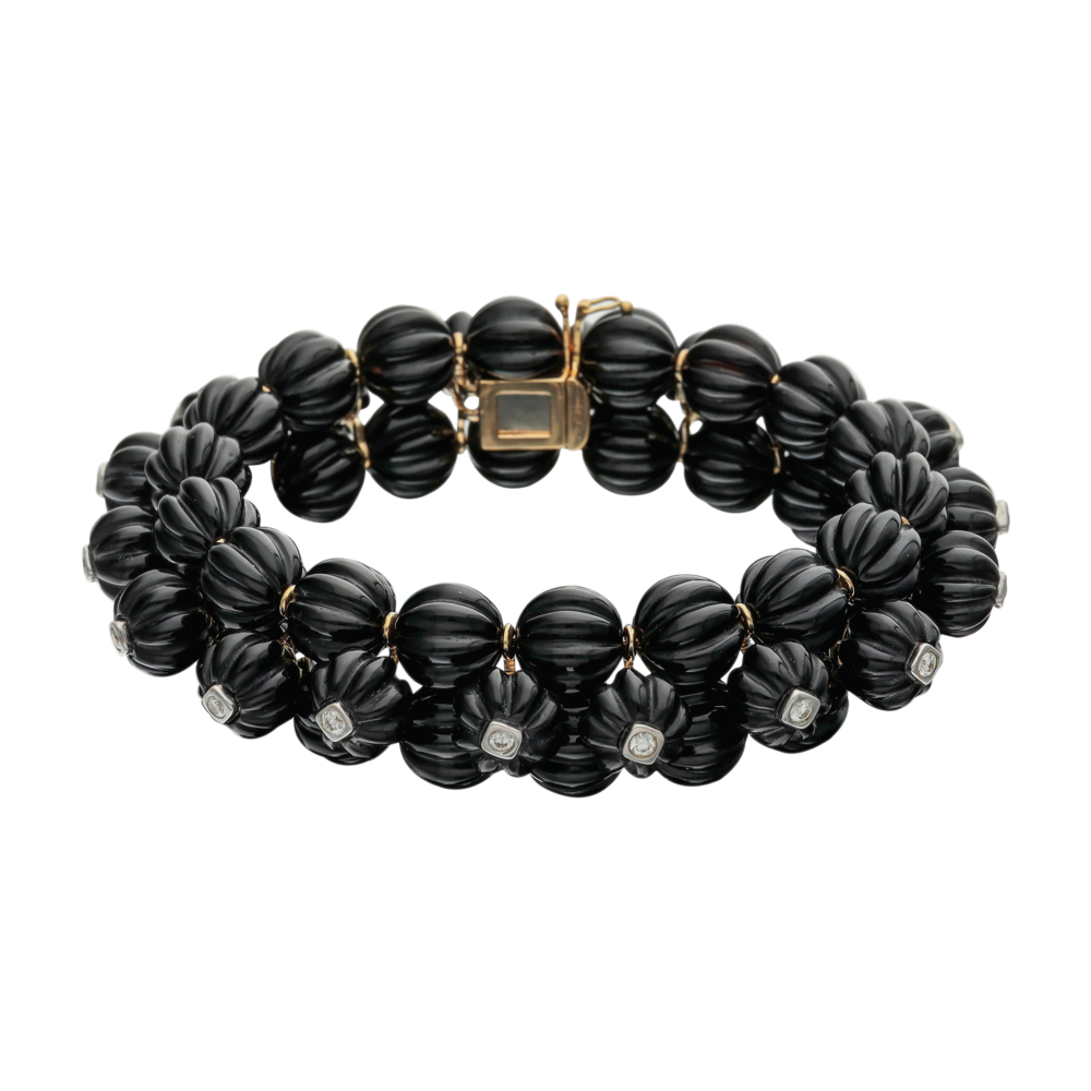 Of flexible design, featuring black onyx accented with round diamonds.