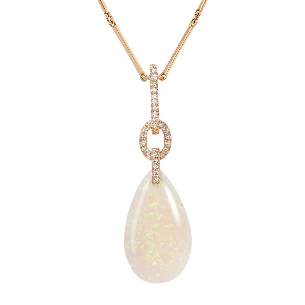 Featuring a teardrop opal accented by 43 white diamonds.