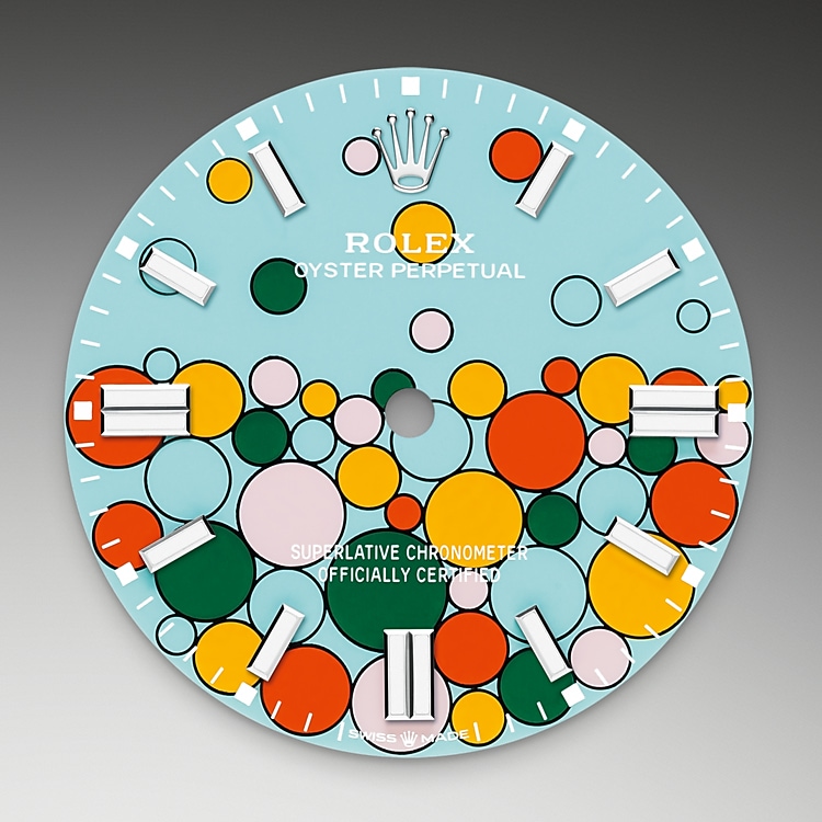 Named ?Celebration?, this brand-new motif is available for the Oyster Perpetual 31, Oyster Perpetual 36 and Oyster Perpetual 41. Composed of differently sized bubbles fringed with black, it encapsulates the vivid colours of the lacquered dials introduced in 2020, bringing turquoise blue into play for the background colour, and candy pink, yellow, coral red and green for the bubbles.