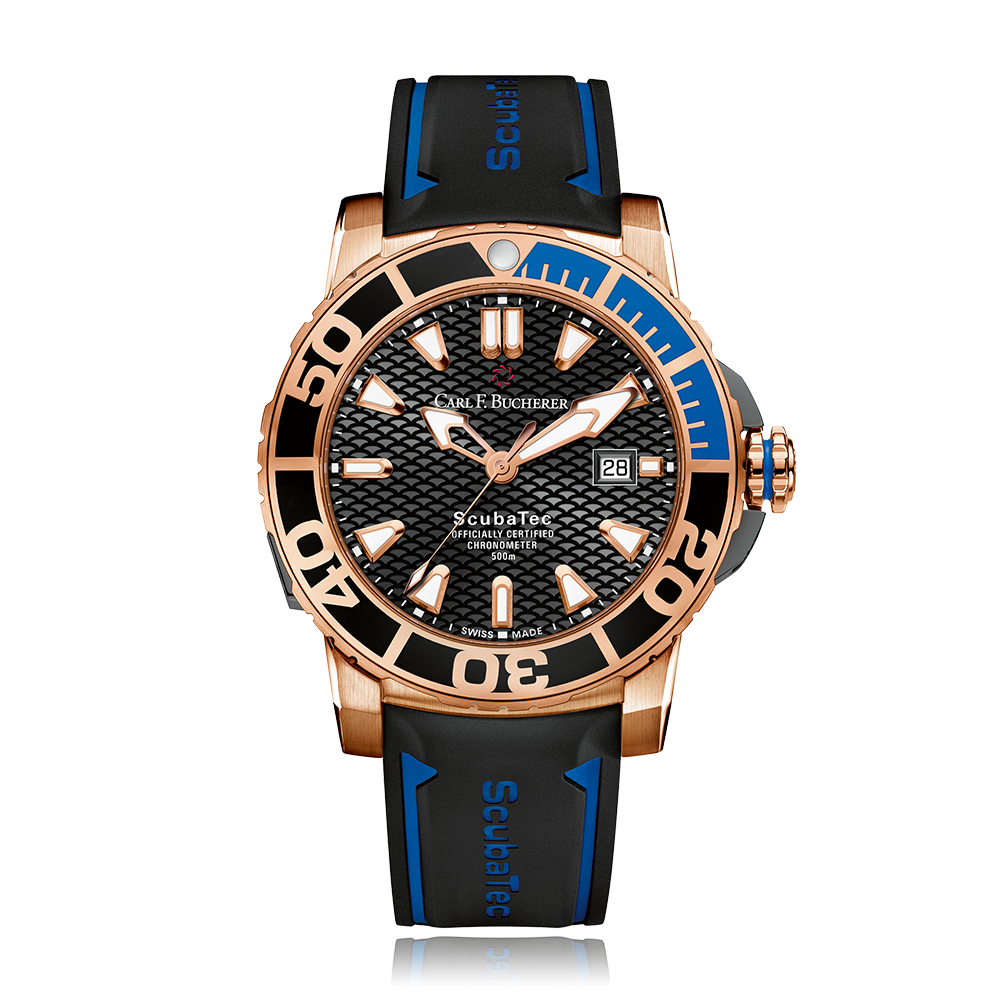 Carl F. Bucherer Patravi with a 45 mm bicolour case and a sapphire glass, water resistant; inside is the automatic calibre 2824-2/sw200, chronograph as additional function a black index face with date indication, the bracelet is a rubber ; accessory: sales box (original), sales guarantee (original).