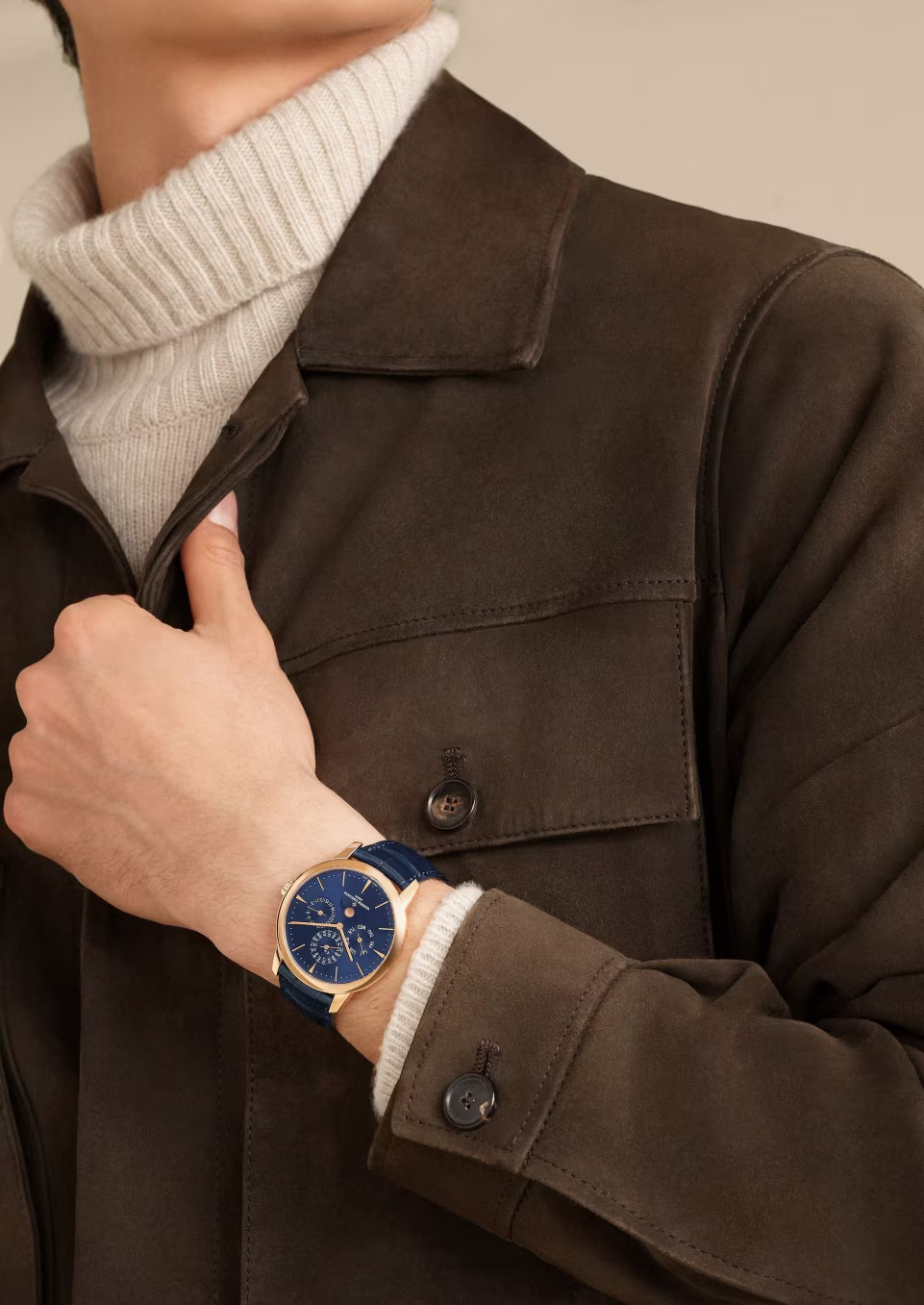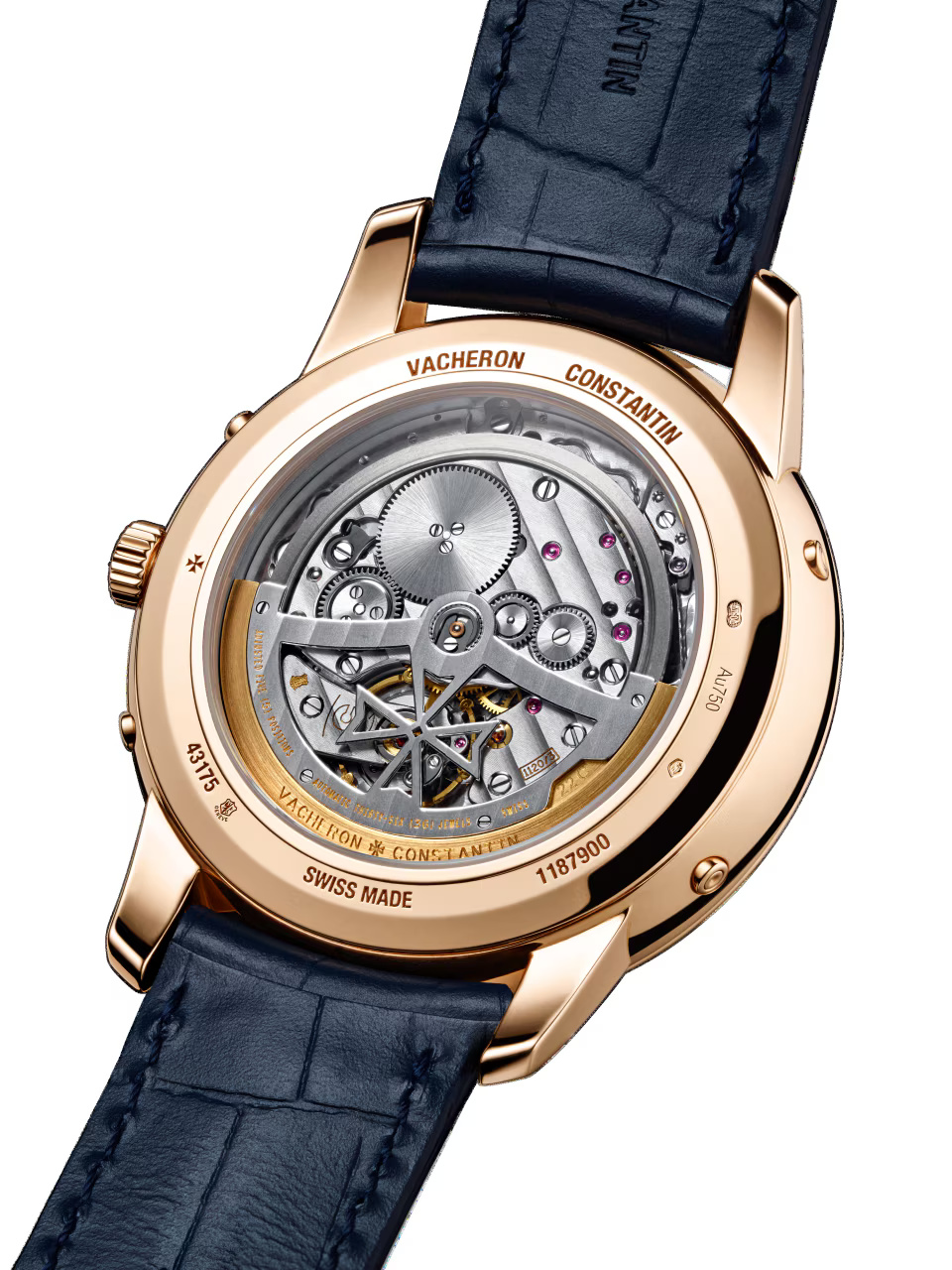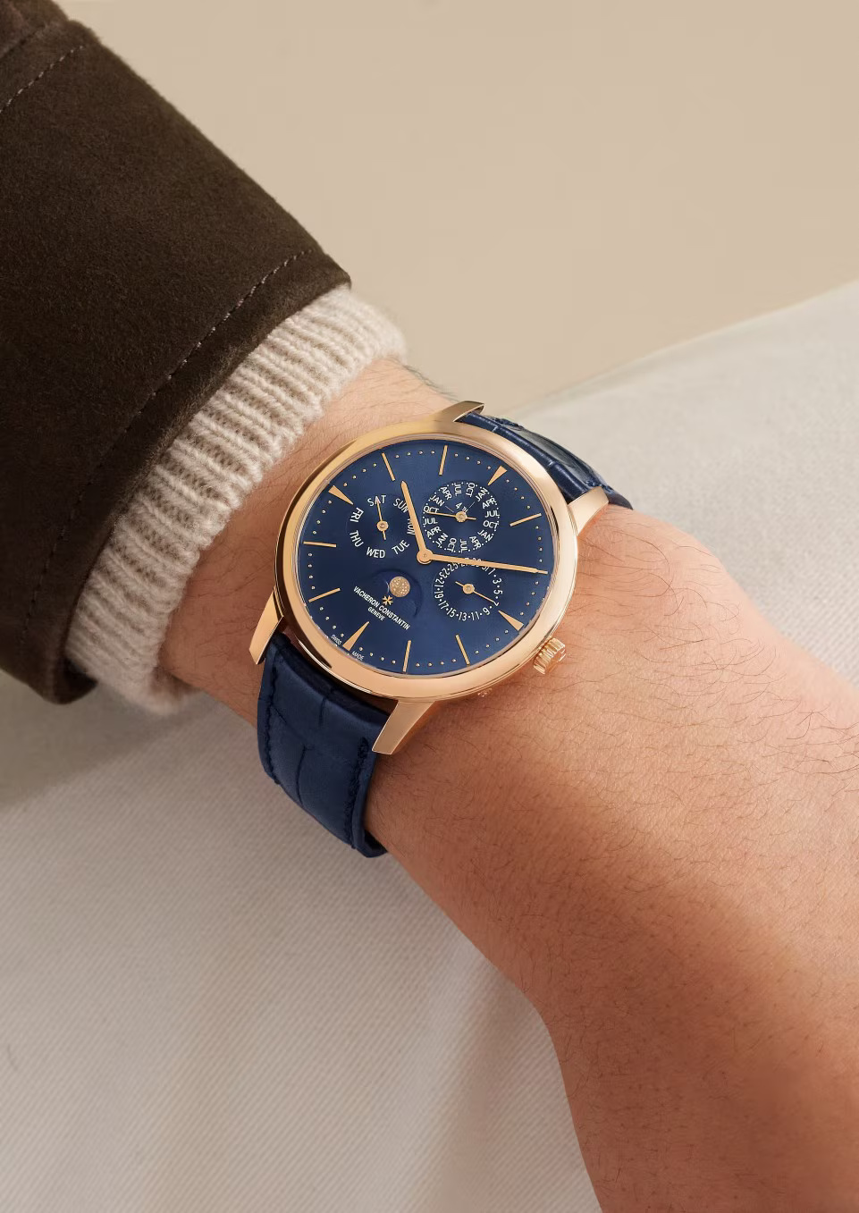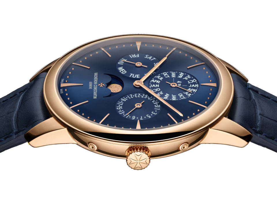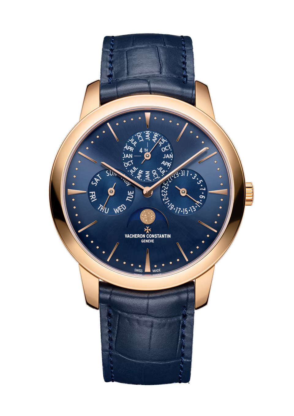 An elegant interpretation of the perpetual calendar, this 18K pink gold watch houses an ultra-slim automatic movement, just 4.05 millimeters thick, which will keep perfect time until 2100. Set at the center of its blue dial, the 18K gold moon phase features a champlev? enamel sky and two hand-finished moons.