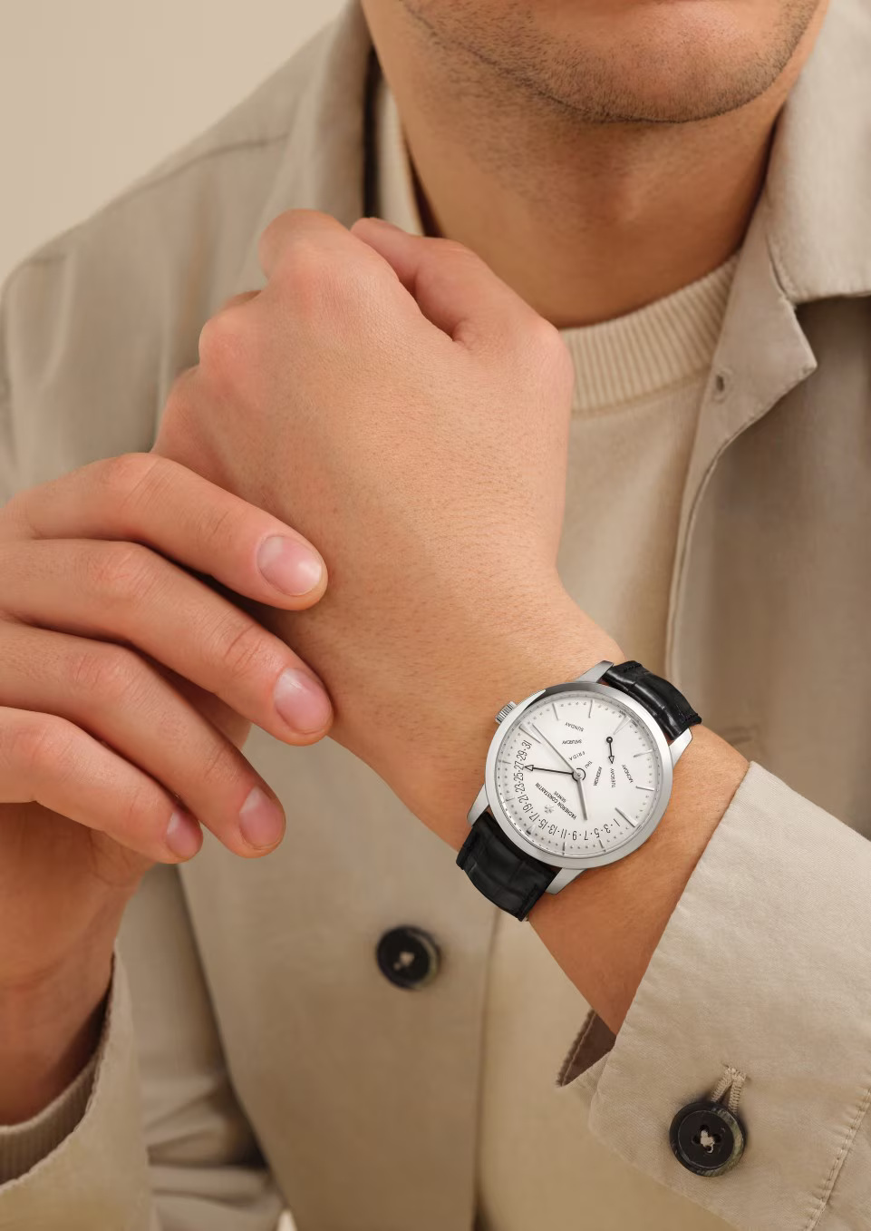 This exquisite, original 18K white gold watch features a rare combination of retrograde hand-type day and date display. Inspired by the designs of the 1950s, the hour markers and hands follow the gentle curve of the dial. The dial sports an external minute-counter made of delicate beads of diamond-polished gold that reflect the light.