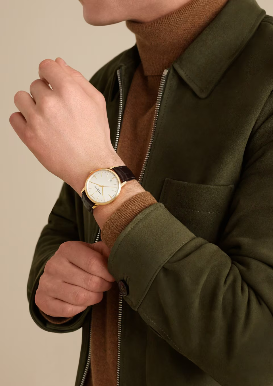 The purity and elegance of this 18K yellow gold watch make it a timeless design. Inspired by the designs of the 1950s, the hour markers and hands gently follow the curve of the dial. Its self-winding movement has an elevated oscillating weight in 22K gold inspired by the Maltese cross.
