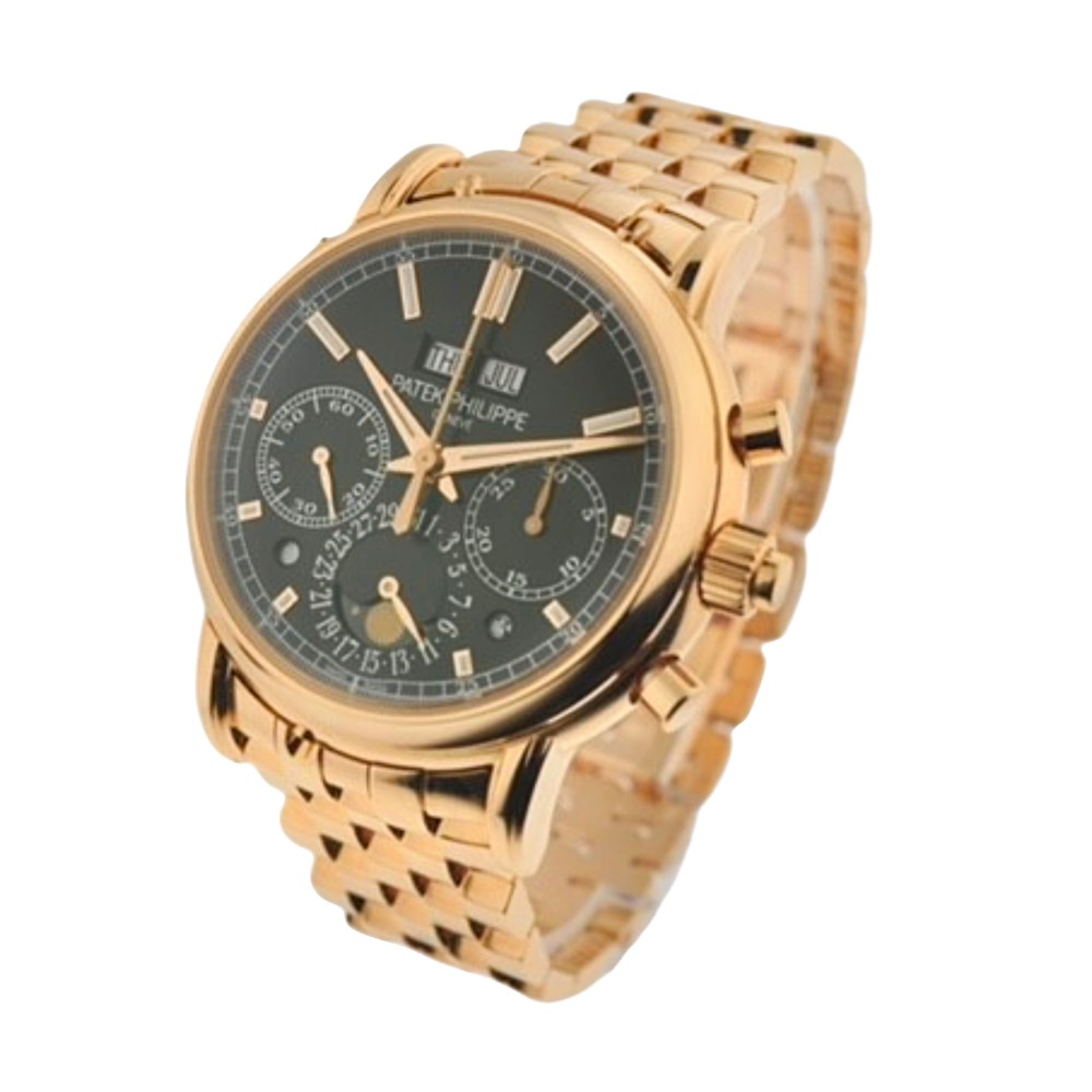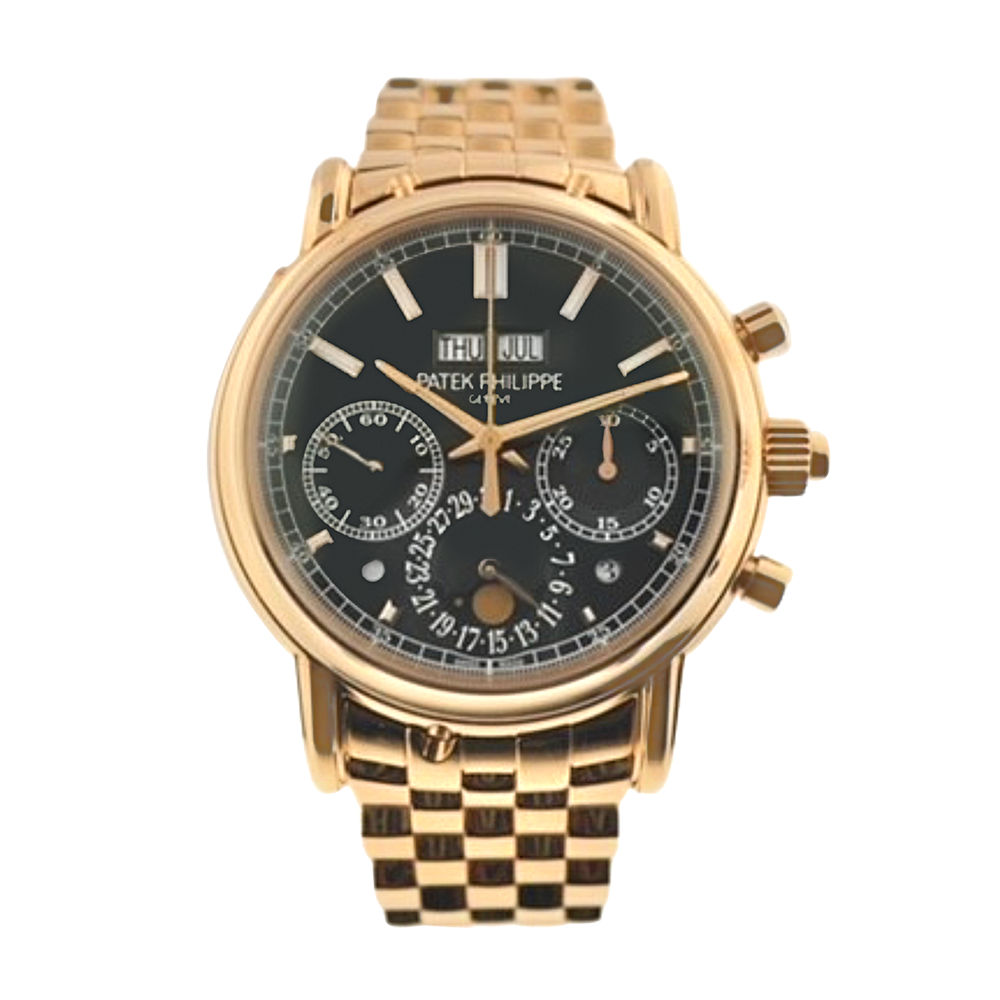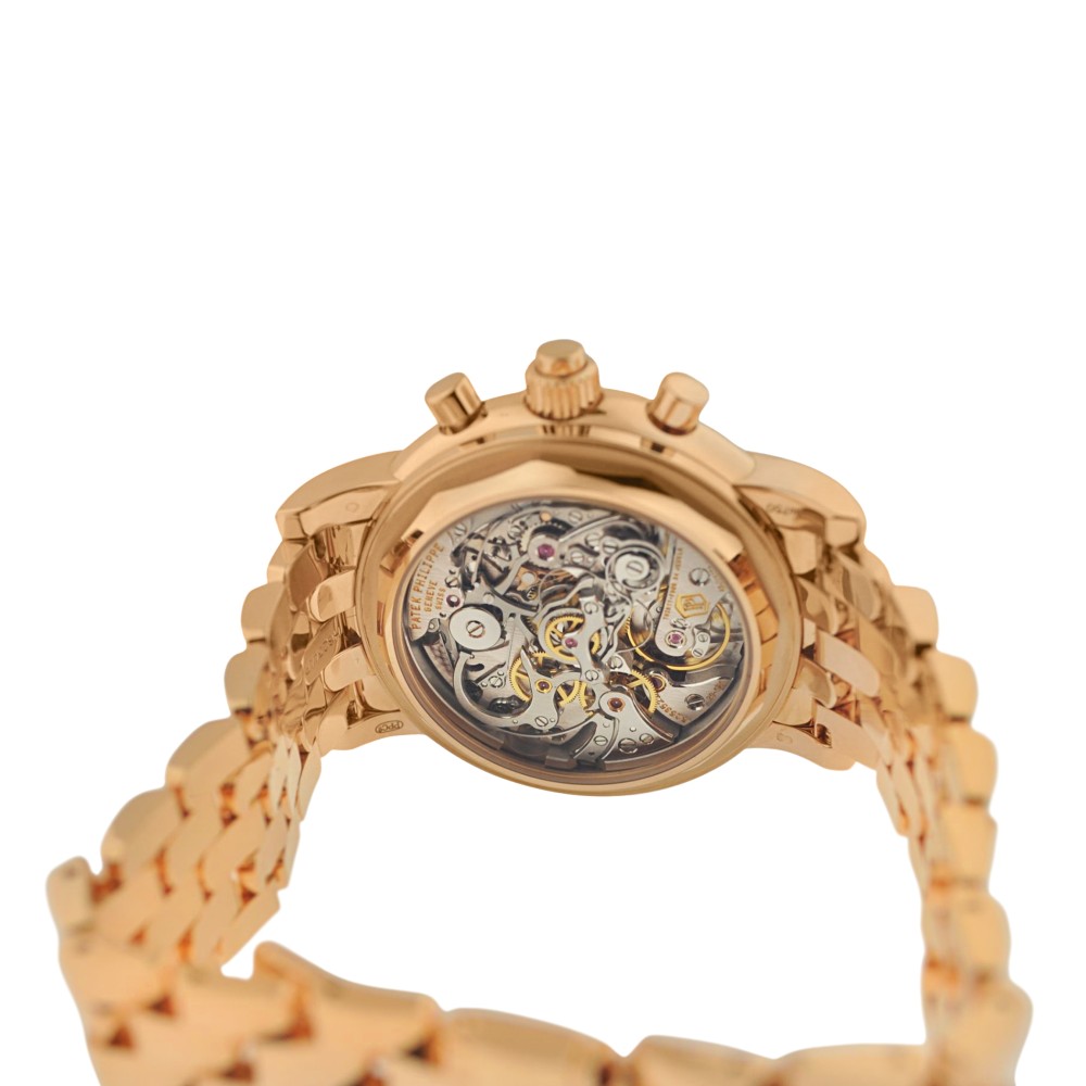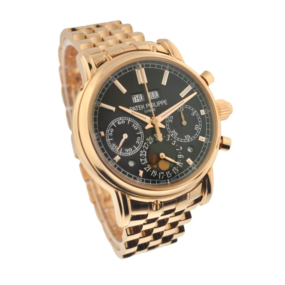 Made exclusively in either platinum or pink gold, the reference 5204 has enjoyed different dial variations after its debut in 2012, with the present watch offered with a black dial and rose gold case. The dial displays the calendar work for the perpetual calendar, the chronograph registers, the subsidiary seconds and an inverted moon phase, with all features balanced out, rendering a beautiful symmetry. The 5204 houses the calibre CH 29-535 PS Q and tops it off with a spring-loaded split seconds lever, reducing offset between the chronograph and split seconds hands, furthermore improving its surgical precision. Registered for an astounding amount of six patents in its painstaking movements, reference 5204 is a true testimony of Patek Philippe?s groundbreaking innovations.