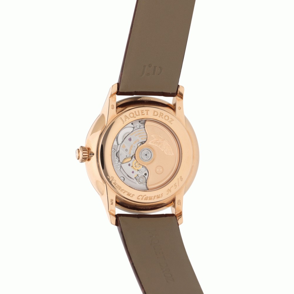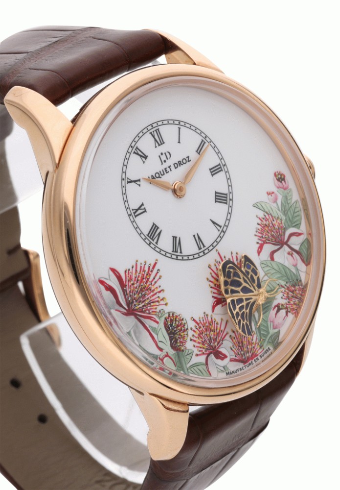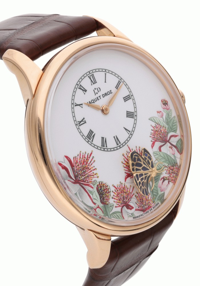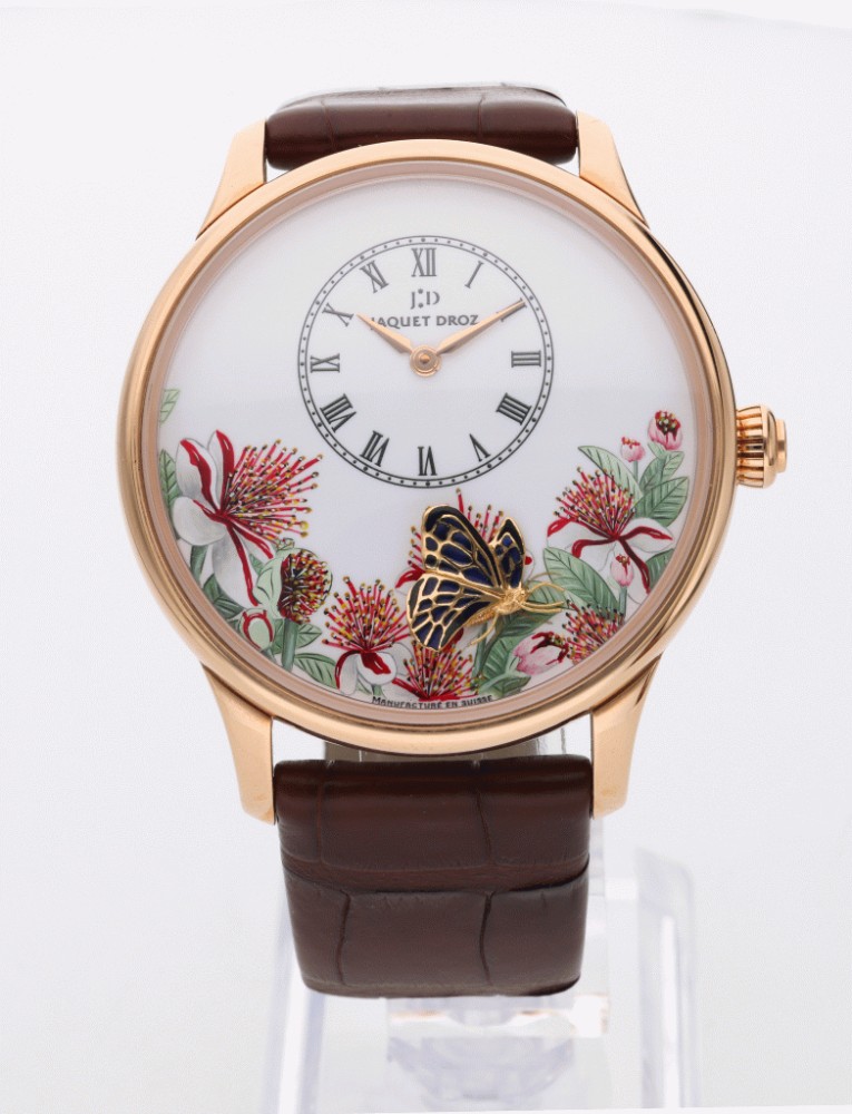 Jaquet Droz often uses butterflies for their timepieces, coming from a motif that was discovered in an old book about Jaquet Droz. A skilled artist, Pierre Jaquet Droz was originally dedicated to drawing a scene involving Cupid driving a chariot pulled by a butterfly.