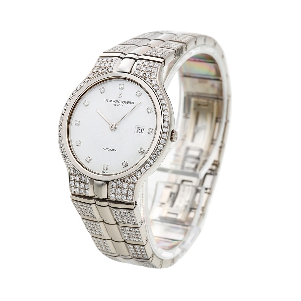 Phidias 58 is an elegant and slim wristwatch. This timepiece features an attractive white dial with diamond-set numerals as well as a white gold and diamond case and bracelet.