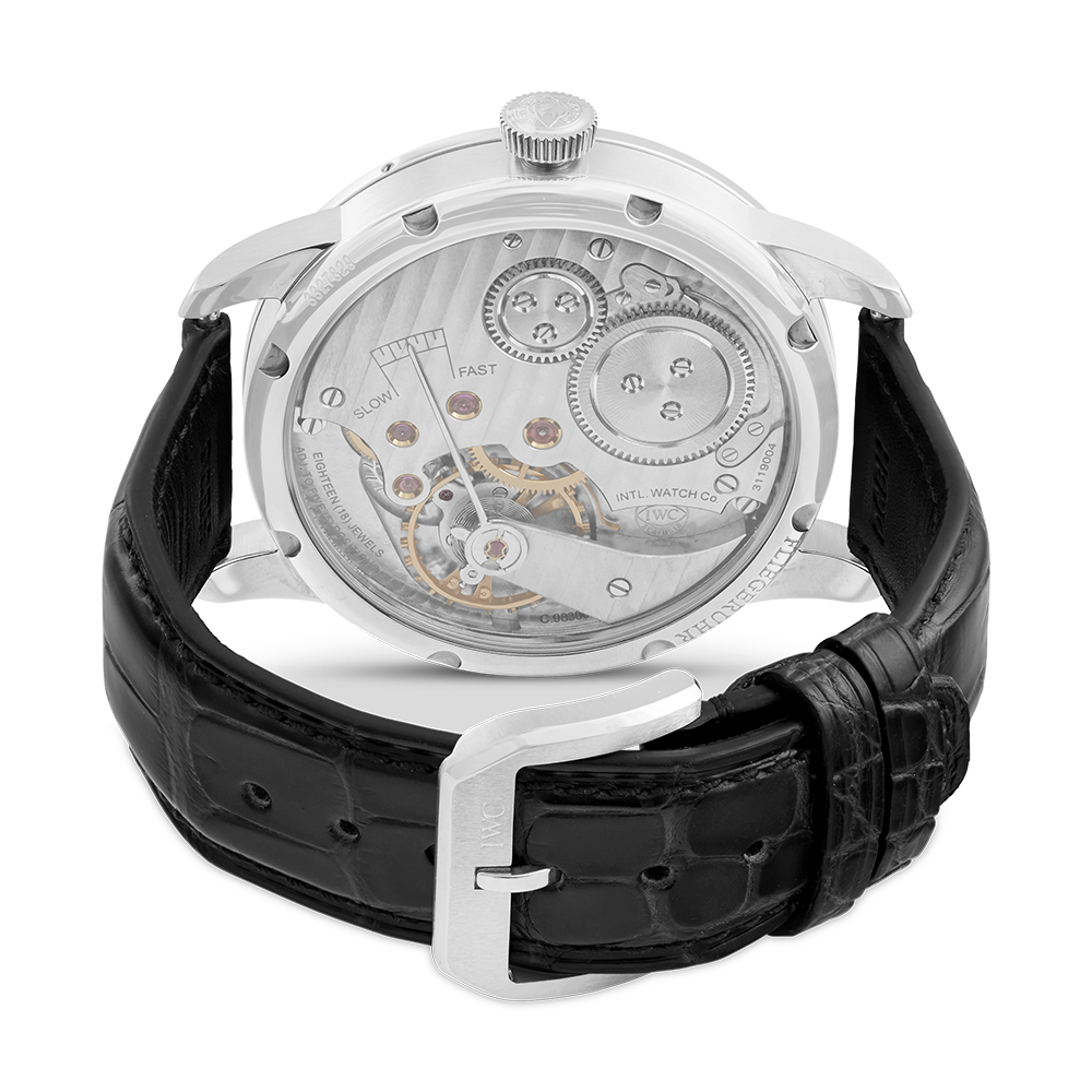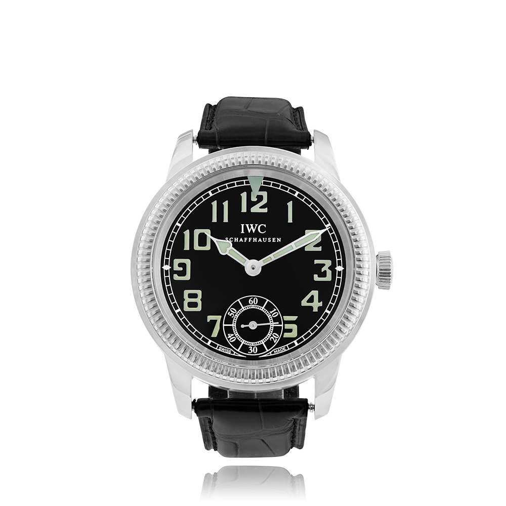 IWC Schaffhausen Pilot with a 44 mm stainless steel case and a sapphire glass, water resistant; inside is the manual calibre 98300, a black arabic face without date indication, the bracelet is a alligator leather; accessory: sales box (original), sales guarantee (original).