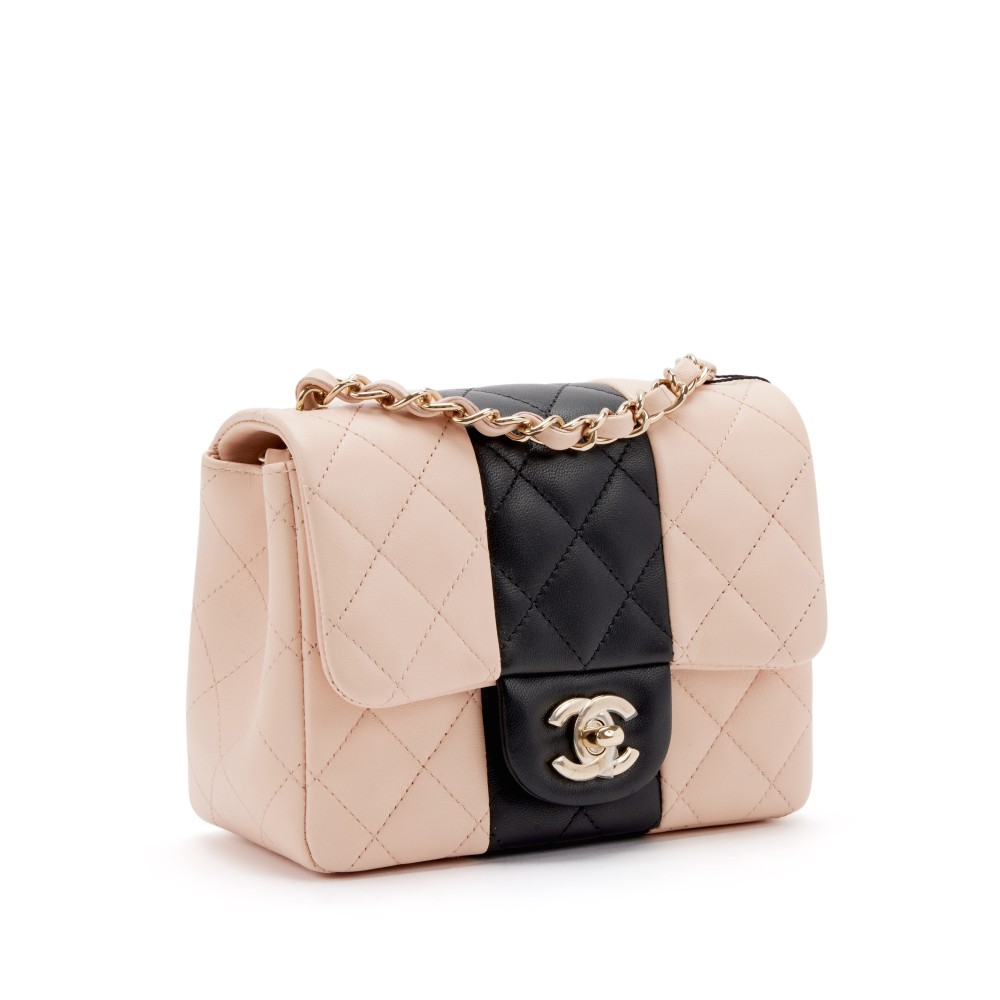 Chanel Pink and Black Quilted Lambskin Mini Square Classic Single Flap Gold Hardware, 2022