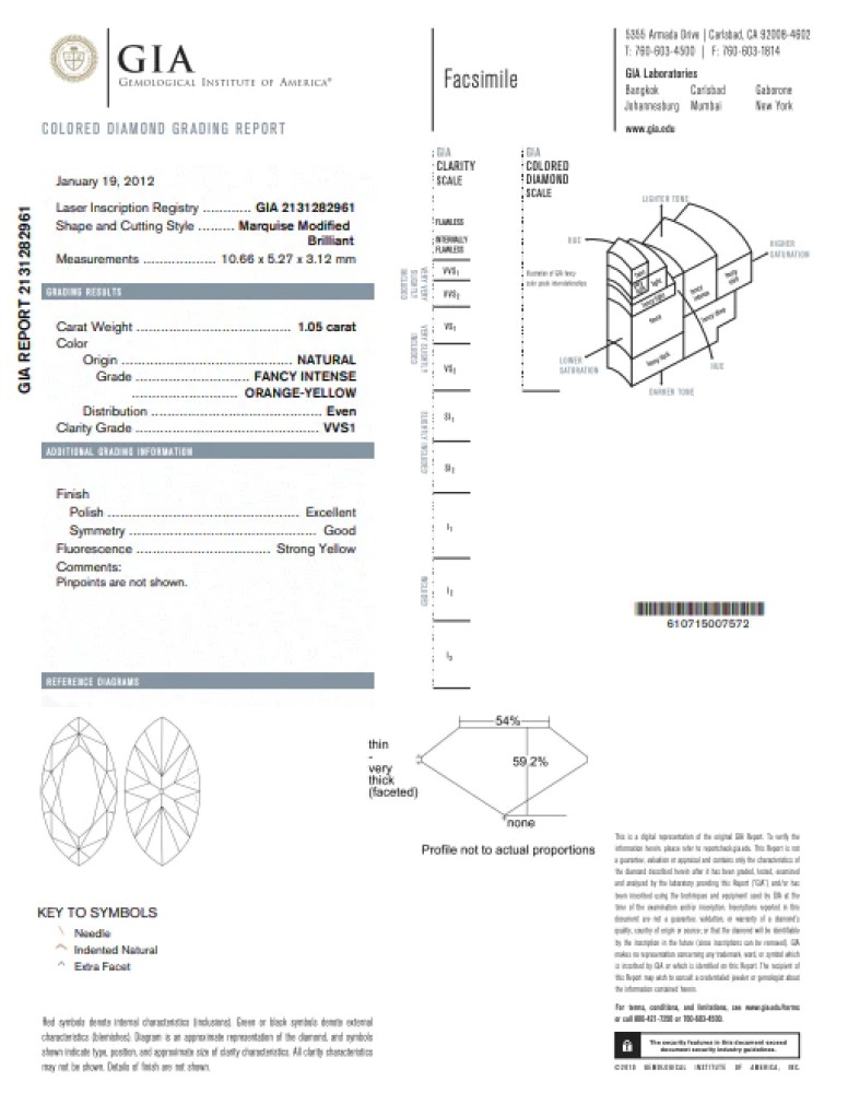 - Accompanied by GIA report no. 2131282961, dated 19 January 2012, stating the 1.05 carat diamond is Fancy Intense Orange-Yellow color and VVS1 clarity