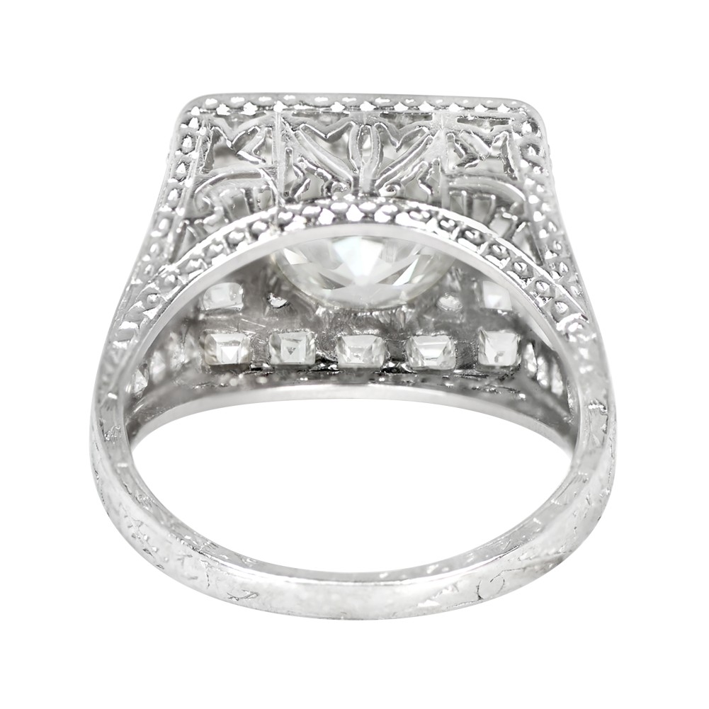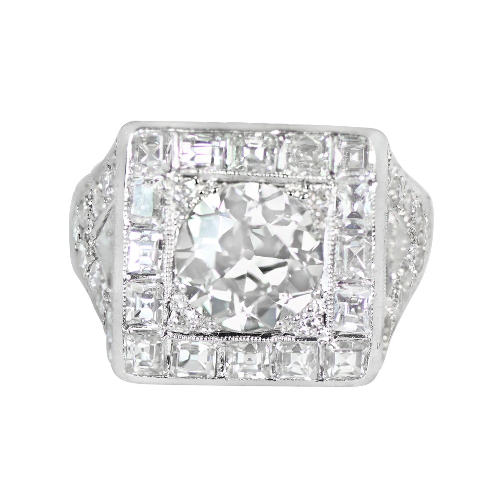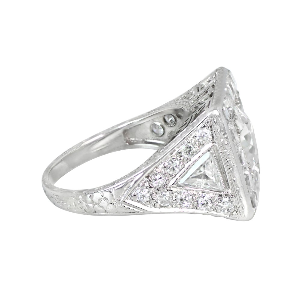 Centering an Old European-cut diamond, accented by 16 antique carre-cut diamonds, 2 trillion-cut diamonds and 18 Old European-cut diamonds.