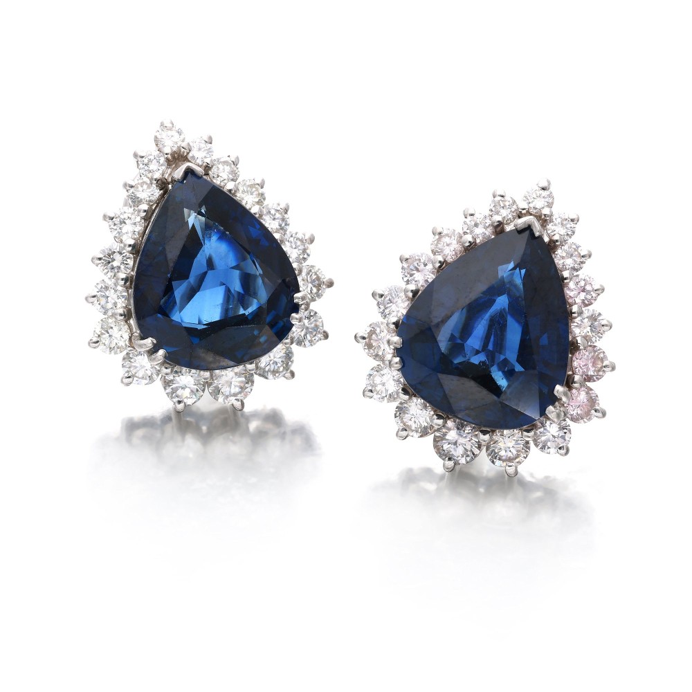 Centering pear shaped sapphires, accented by diamonds.
