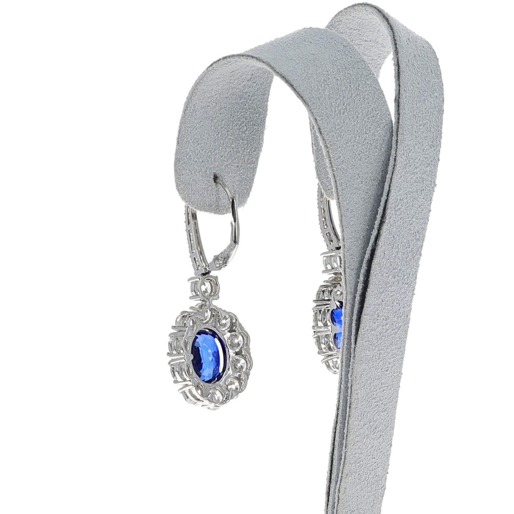 Centering oval-shaped Madagascar sapphires and accented by round brilliant-cut diamonds.
