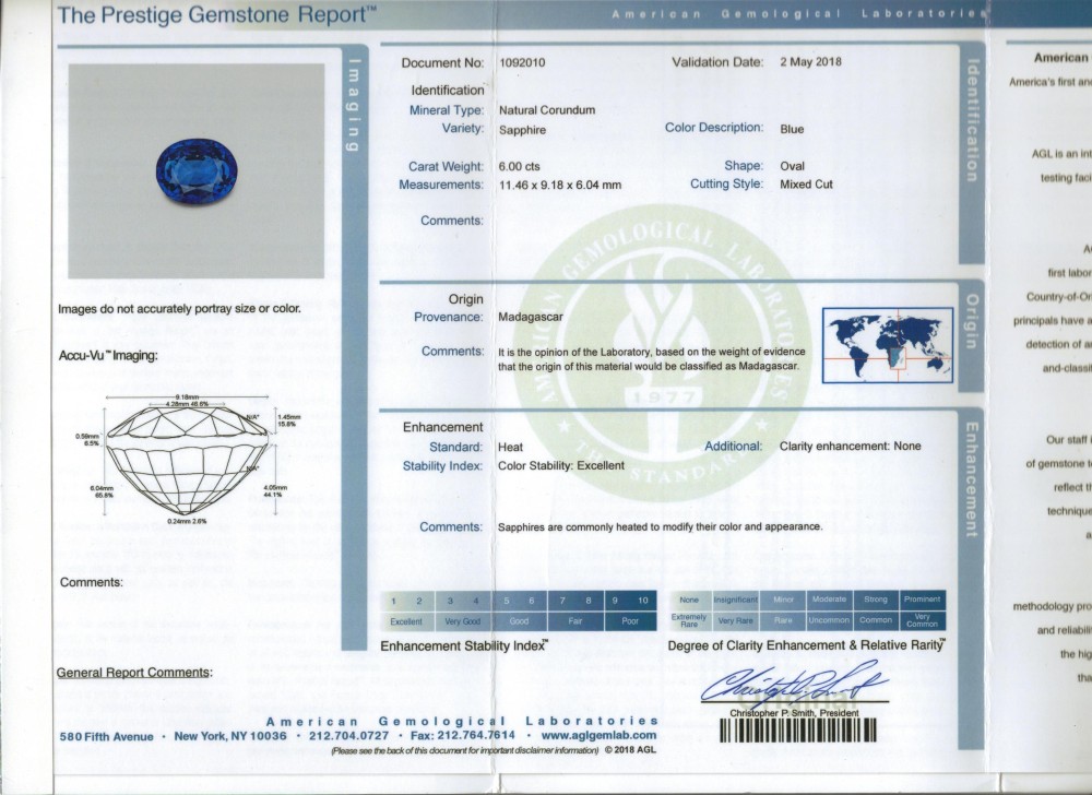 - Accompanied by AGL report no. 1092010 dated 2 May 2018, stating that the 6.00 carat sapphire is of Madagascar origin with standard heat treatment