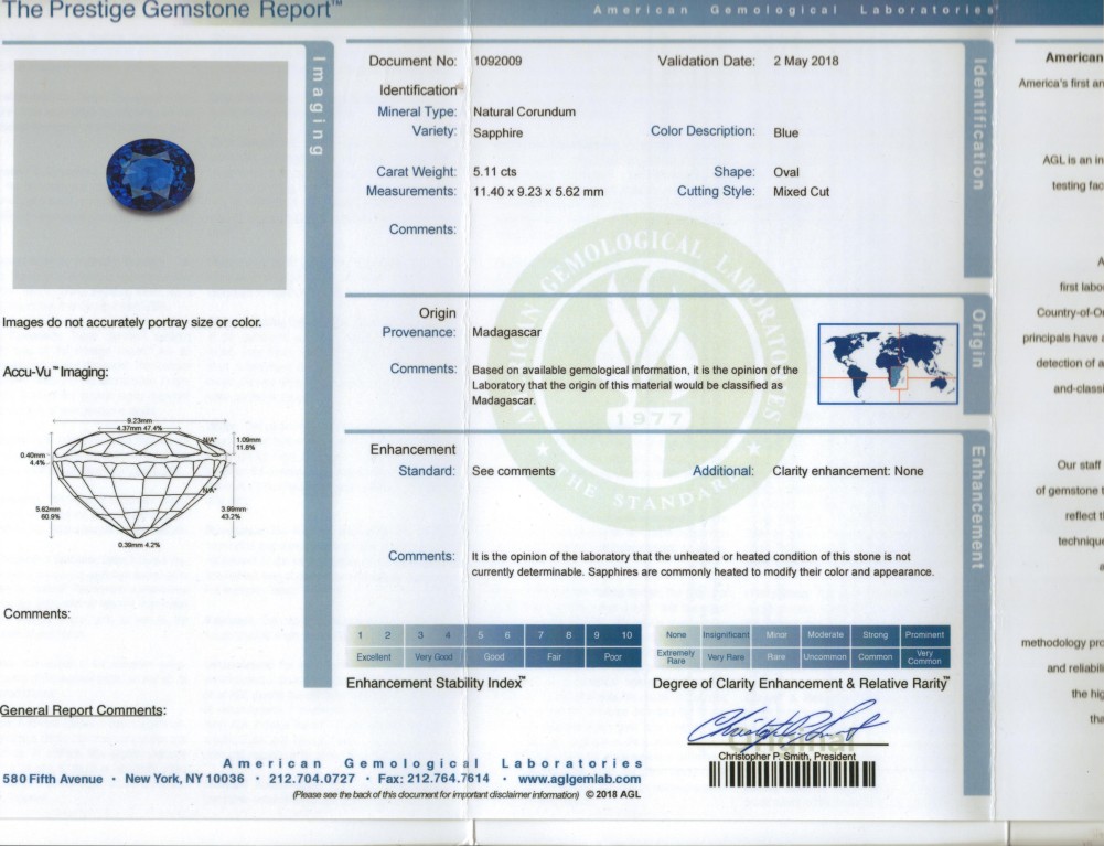 - Accompanied by an AGL report no. 1092009 dated 2 May 2018, stating that the 5.11 carat sapphire is of Madagascar origin with no clarity enhancement, heat treatment not currently determinable