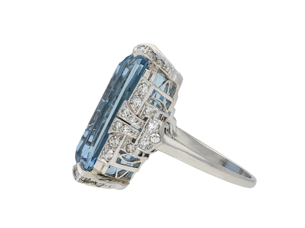 Centrally set with an octagonal scissor-cut natural aquamarine in an open-back claw setting, further set with 38 cut diamonds.