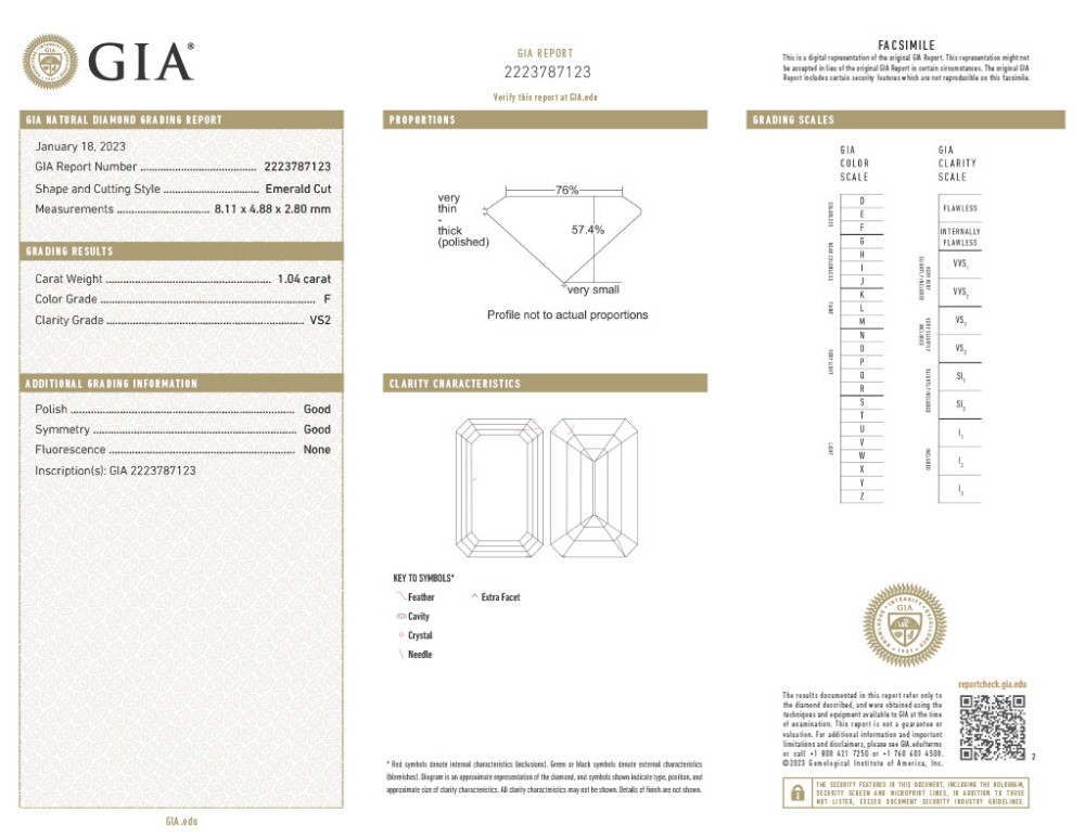 - Accompanied by GIA report no. 2223787123, dated 18 January 2023, stating that the 1.04 carat diamond is F color and VS2 clarity