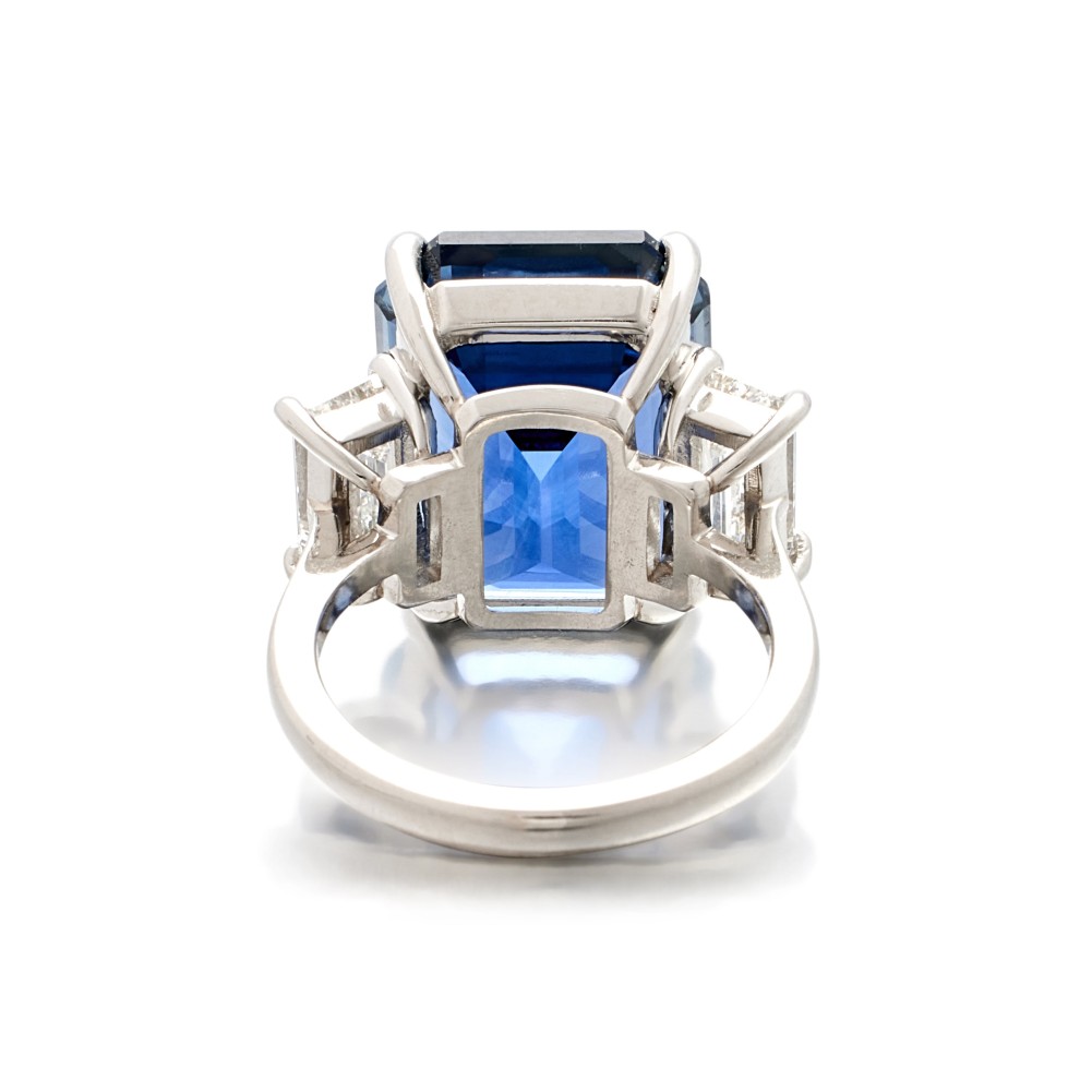 Composed of an emerald-cut ceylon sapphire accented by emerald-cut diamonds.