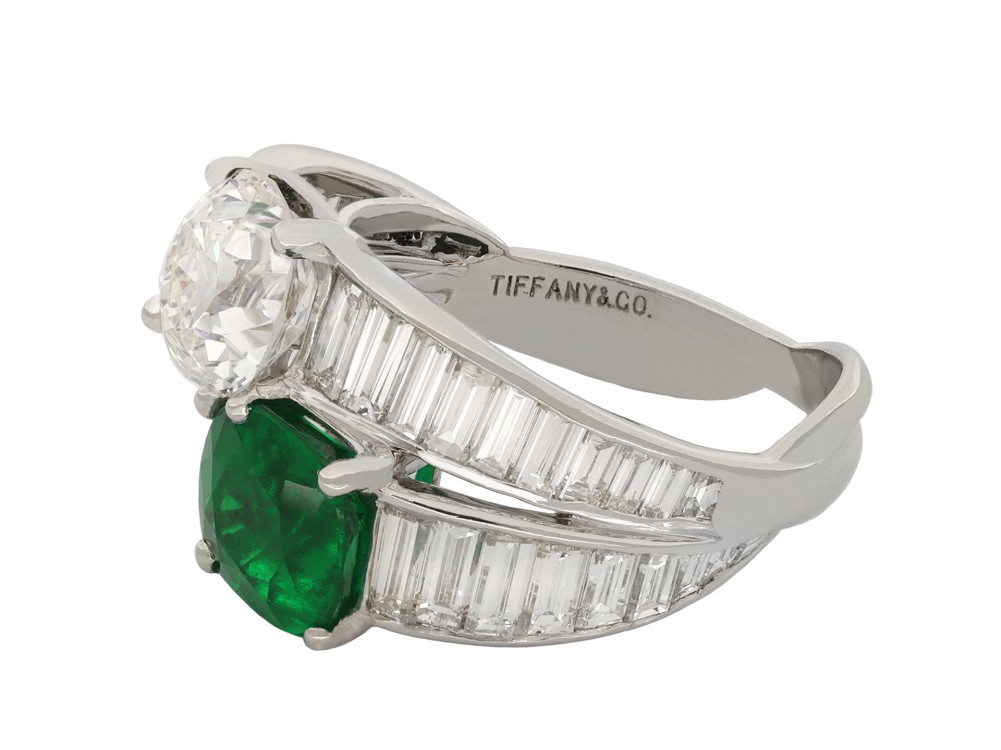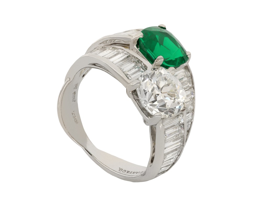 Diagonally set with one cushion-shaped old-cut natural Colombian emerald, further set with one cushion-shaped old mine diamond in open clawback setting, flanked by 38 rectangular baguette-cut diamonds