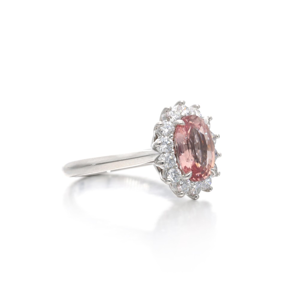 Composed of an oval-shaped padparadscha sapphire and accented by round brilliant-cut diamonds.