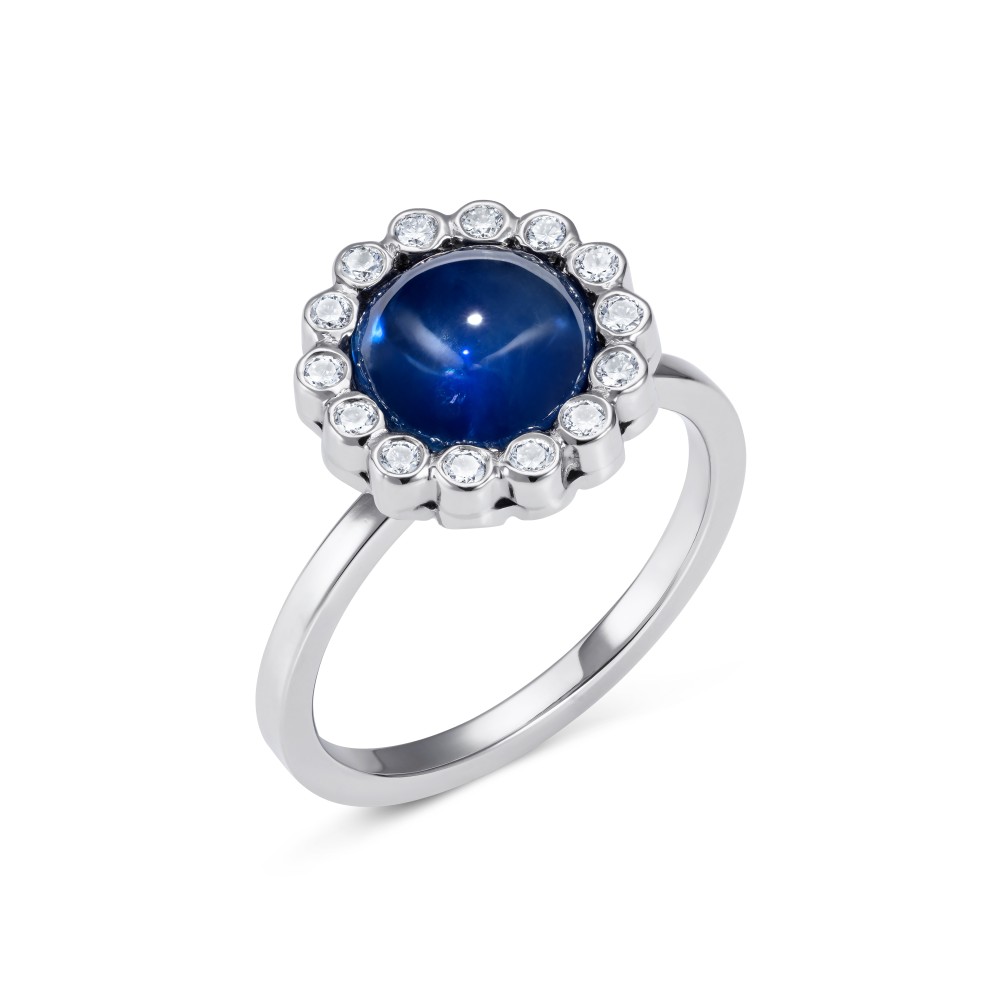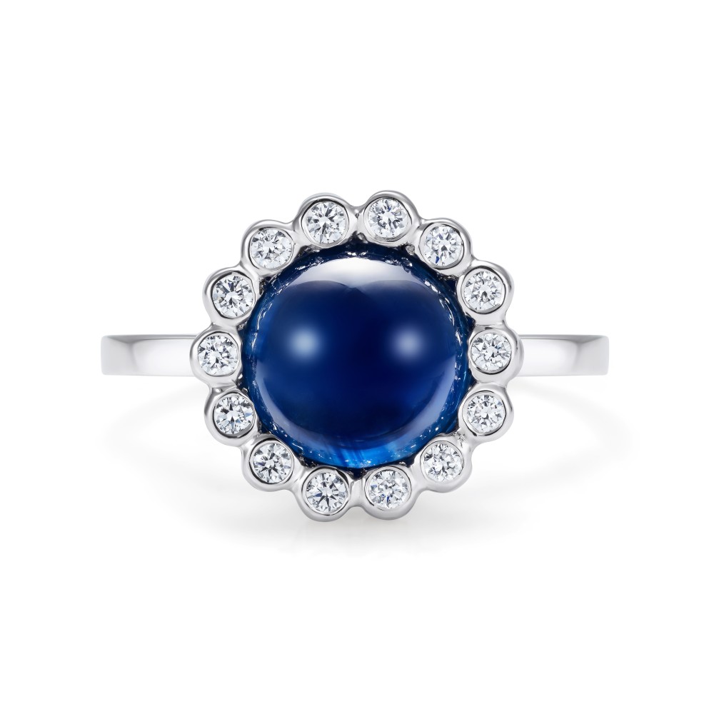 Blue sapphire cabochon diamond halo ring in platinum