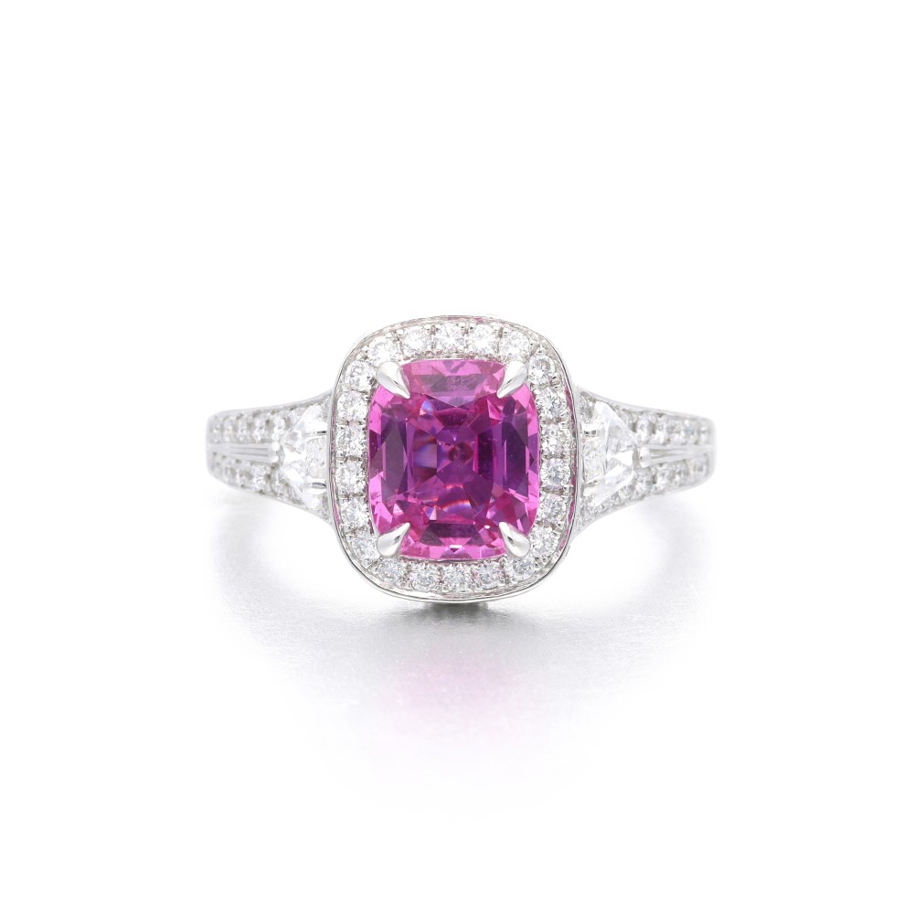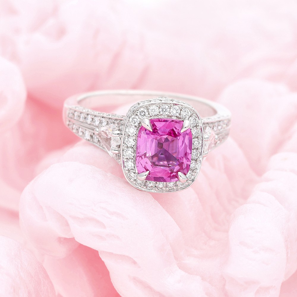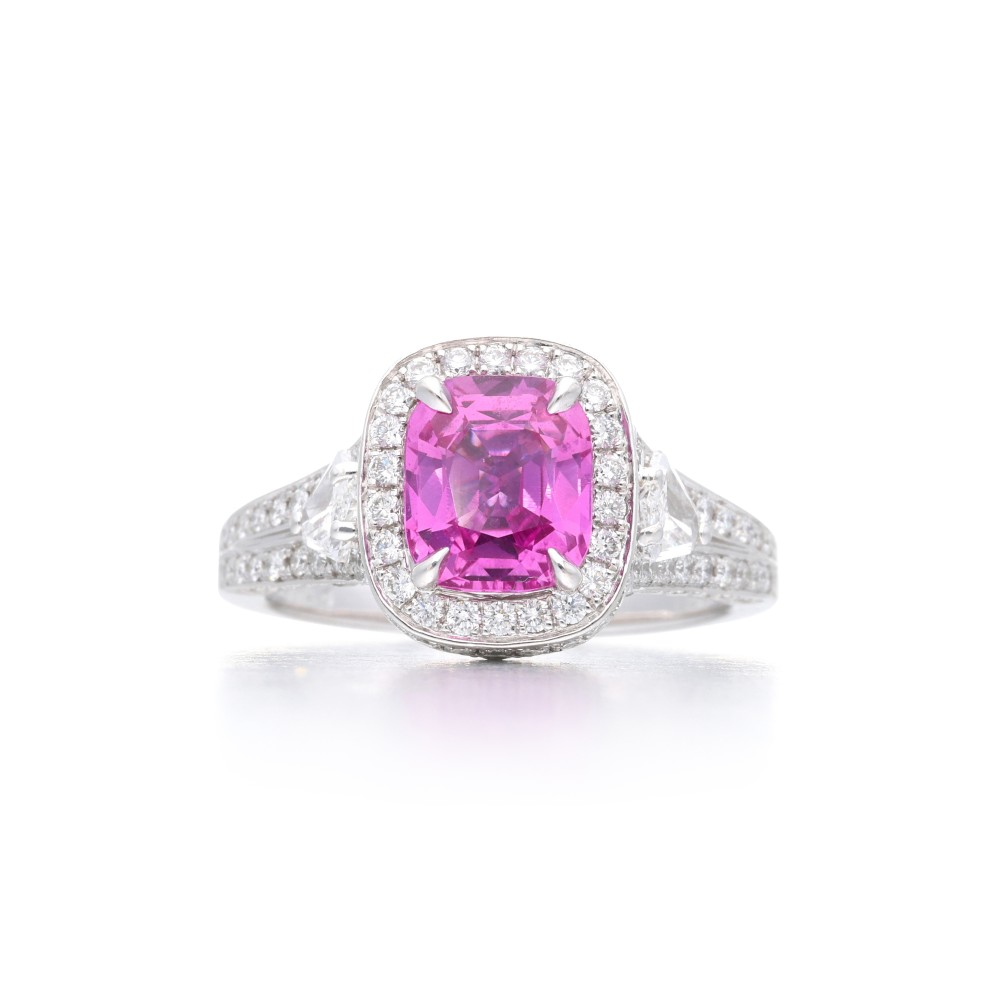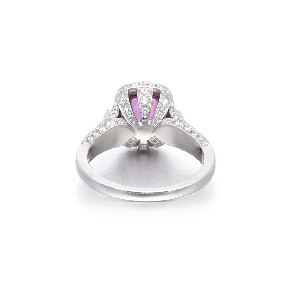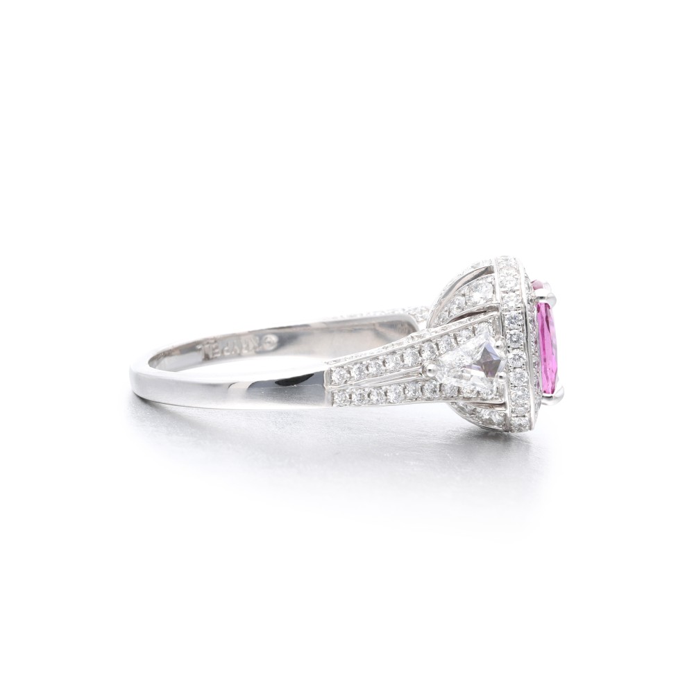 Centering a pink sapphire surrounded by a diamond halo and accented with additional diamonds on the crown and band.