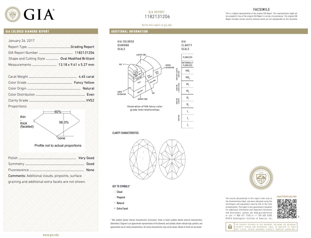 - Accompanied by GIA report no. 1182131206, dated 26 January 2017, stating that the 4.45 carat diamond is Fancy Yellow color and VVS2 clarity