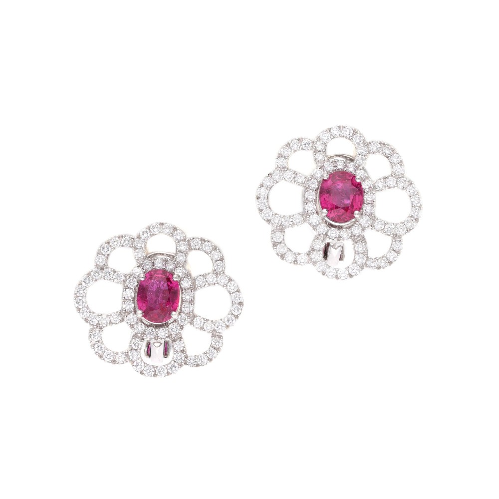 Centering oval-shaped rubies and accented by round brilliant-cut diamonds.