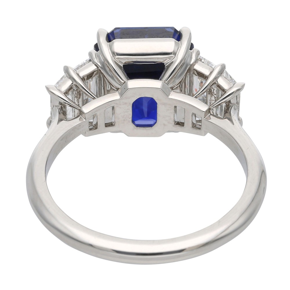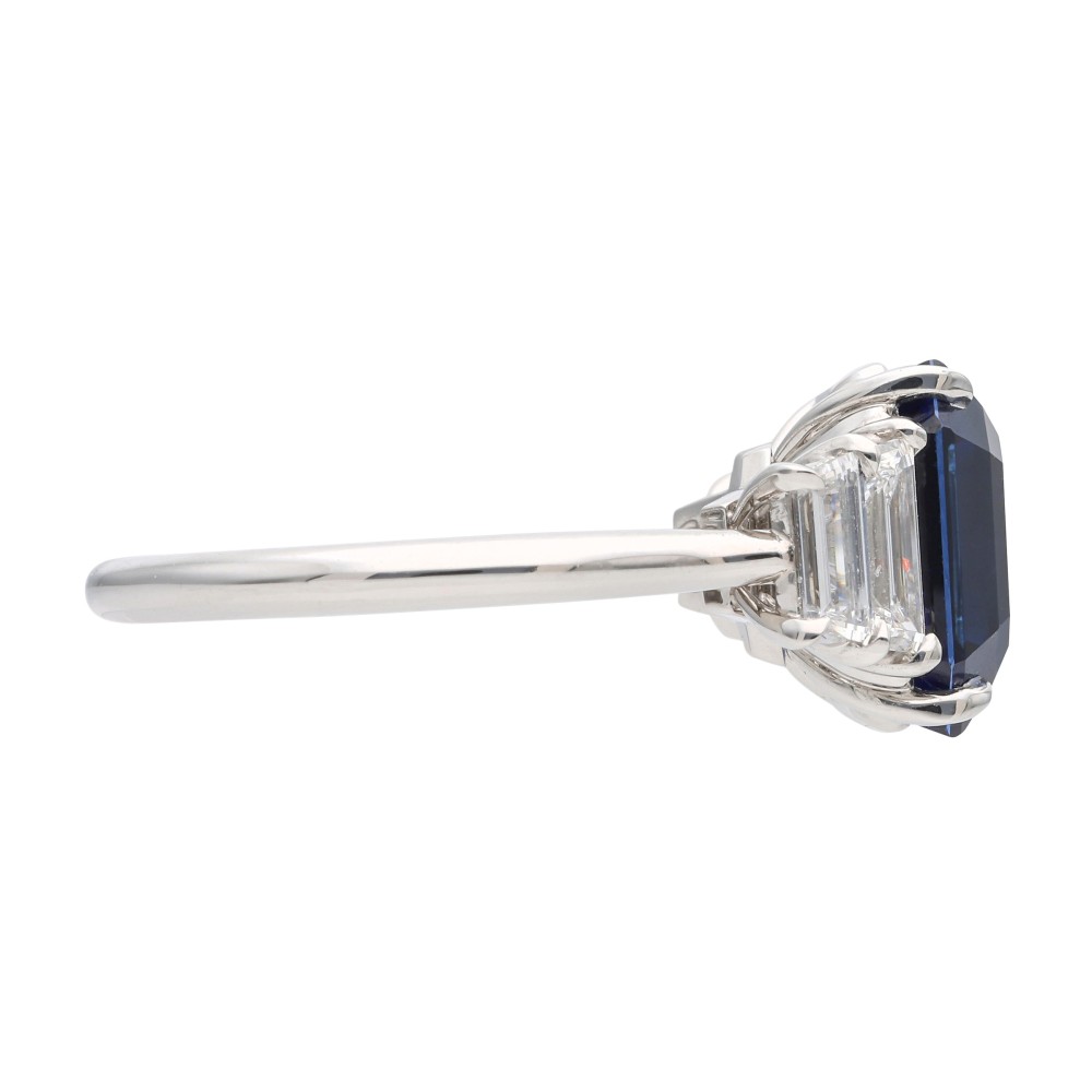 Centering a rectangular emerald cut sapphire, flanked by 2 baguette diamonds on each side.