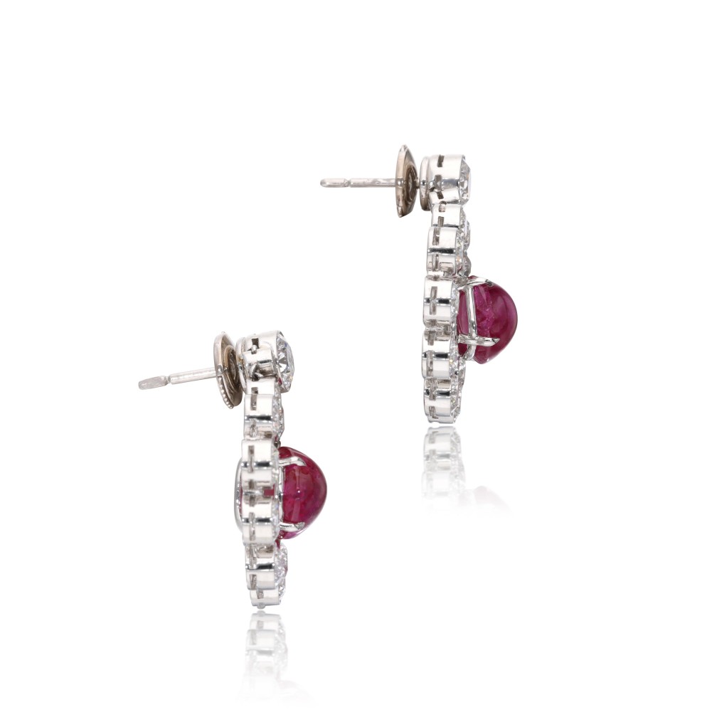 Set with 2 round Burma ruby cabochons, decorated by 24 round diamonds.