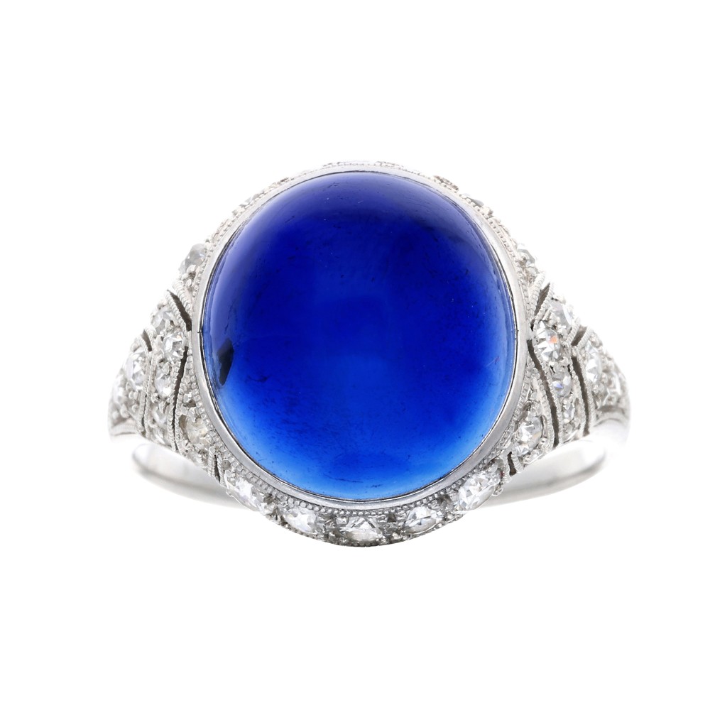Featuring an oval cabochon sapphire, accented by round diamonds.