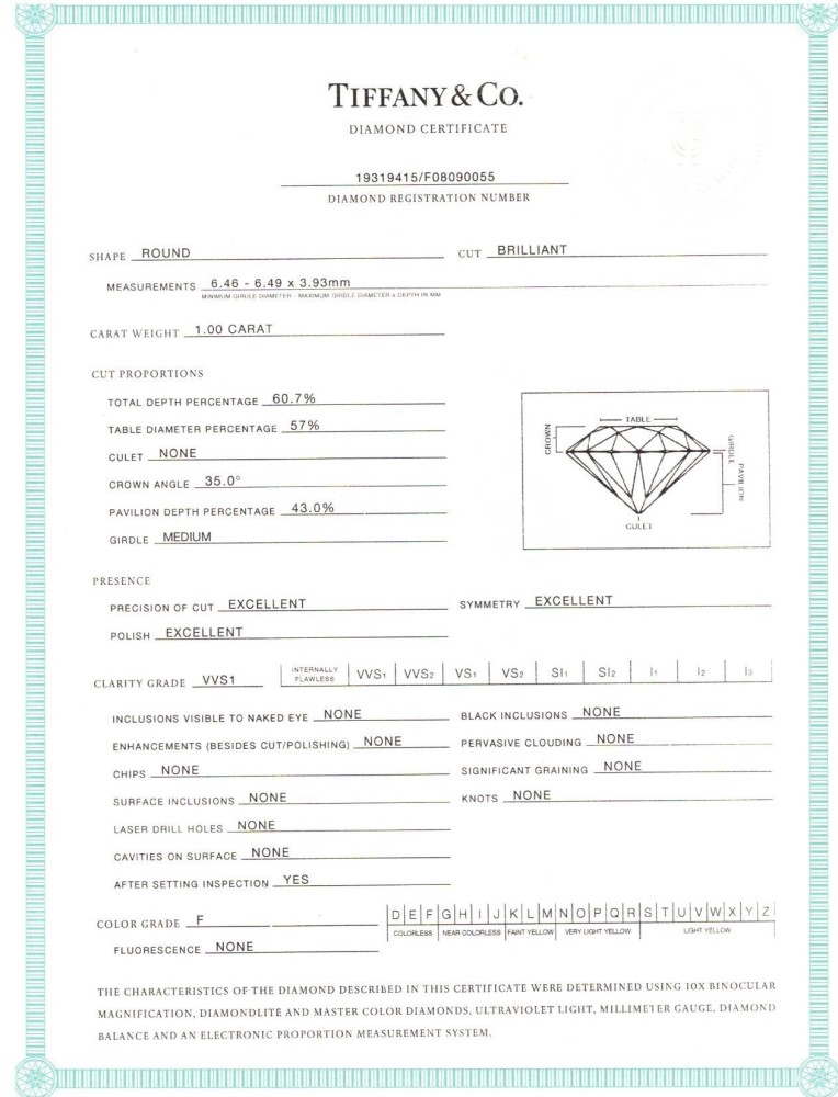 - Accompanied by GIA report no. 13387875, dated 22 May 2004, stating that the 1.00 carat round brilliant-cut diamond is F color and VVS1 clarity