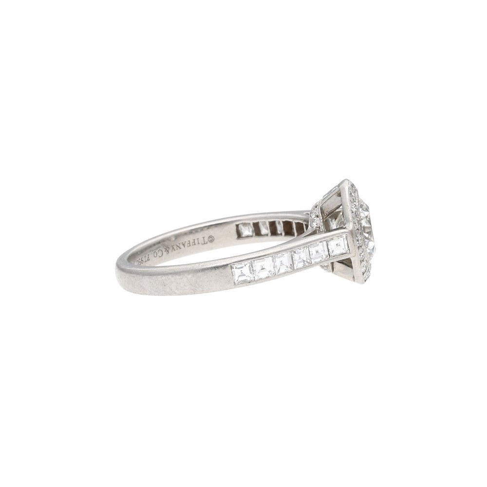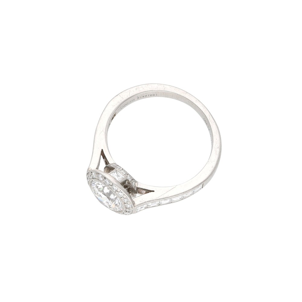 Centering a round brilliant-cut diamond, accented by rectangular and round brilliant-cut diamonds.