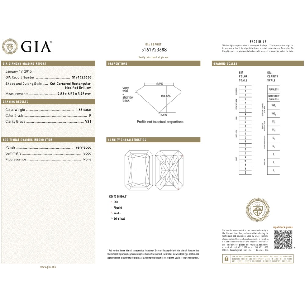 - Accompanied by GIA report no. 5161923688, dated 19 January 2015, stating that the 1.63 carat diamond is F color, VS1 clarity