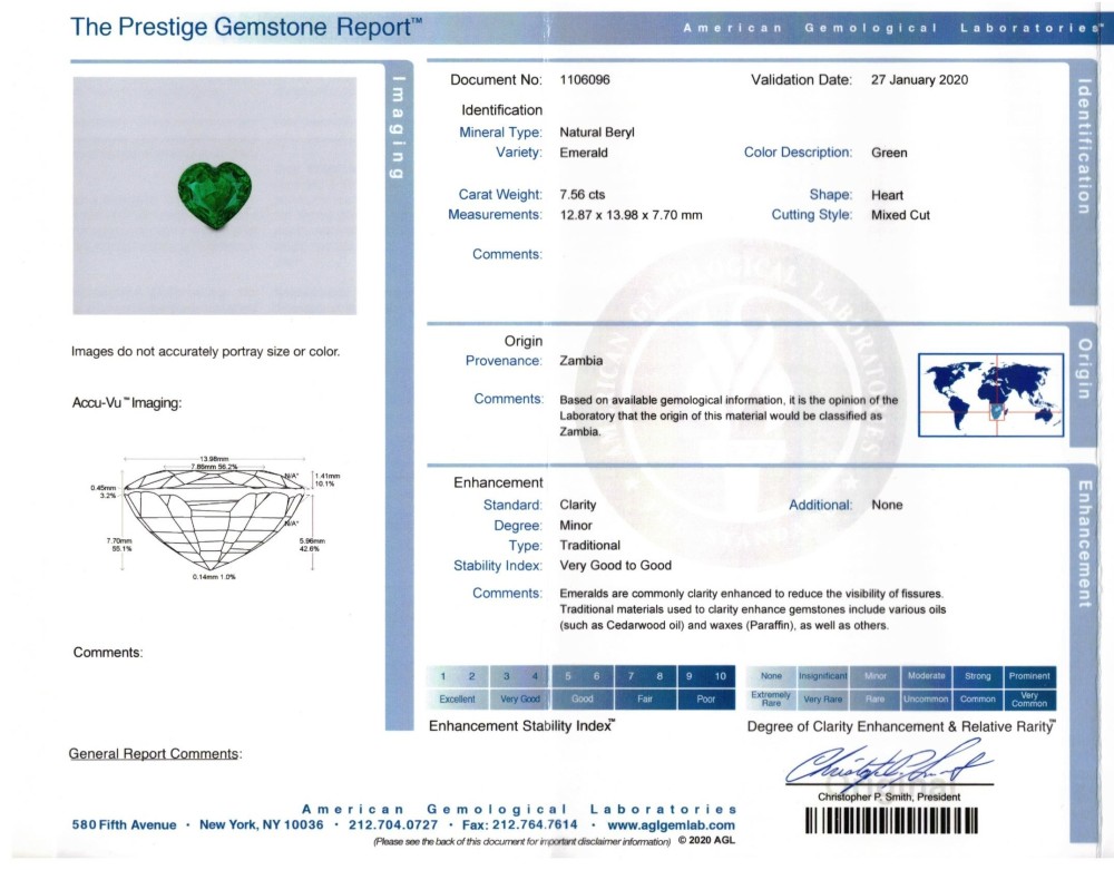 - Accompanied by AGL report no. 1106096, dated 27 January 2020, stating that the 7.56 carat emerald is of Zambian origin and shows minor clarity enhancement