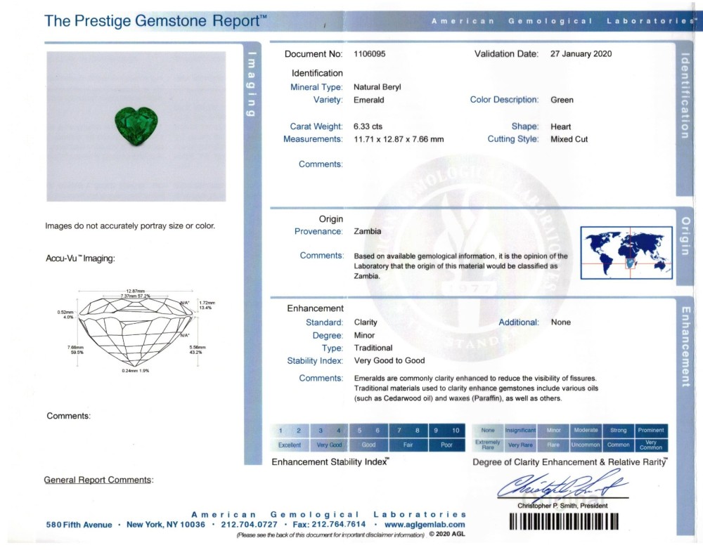 - AGL report no. 1106095, dated 27 January 2020, stating that the 6.33 carat emerald is of Zambian origin and shows minor clarity enhancement