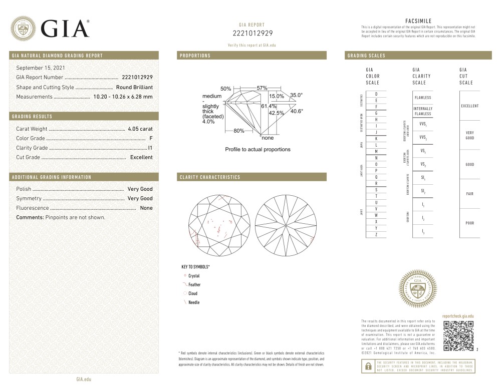 - Accompanied by GIA report no. 2221012929, dated 15 September 2021, stating that the 4.05 carat diamond is F color and I1 clarity