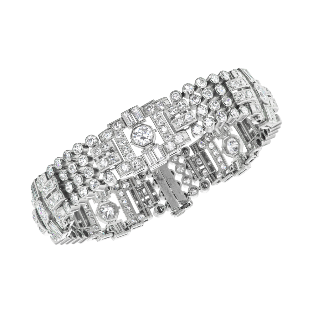 Of art deco period design, set with round diamonds and baguette diamonds mounted in platinum.