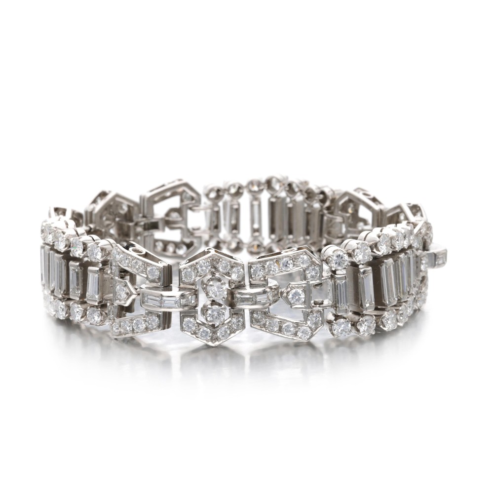 Composed of round brilliant- and baguette-cut diamonds.