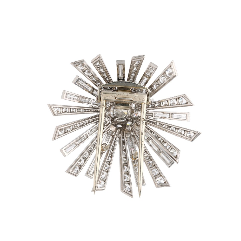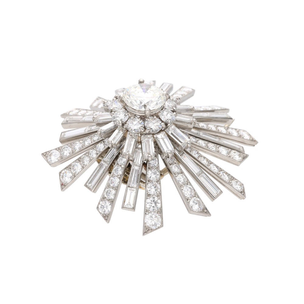 Starburst brooch centering a round brilliant-cut diamond, accented by baguette and round-cut diamonds.