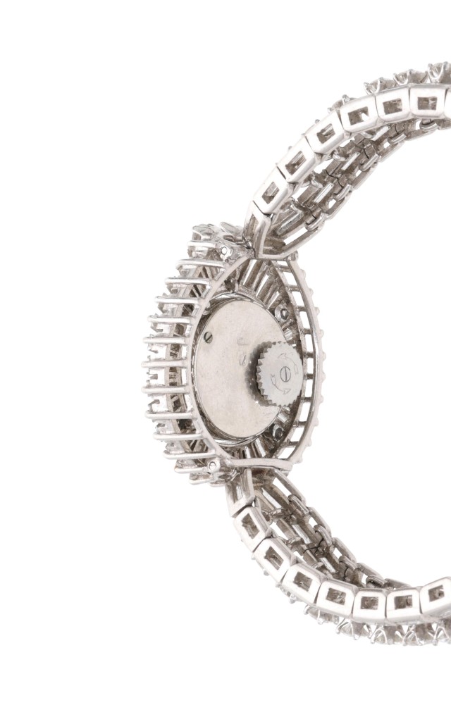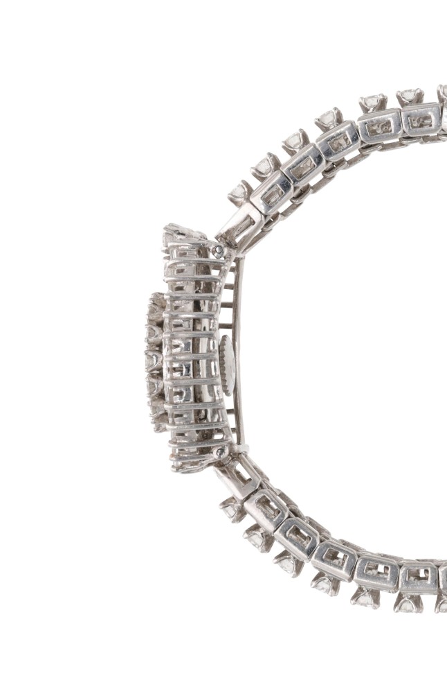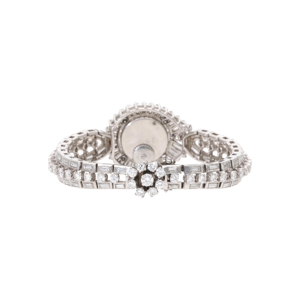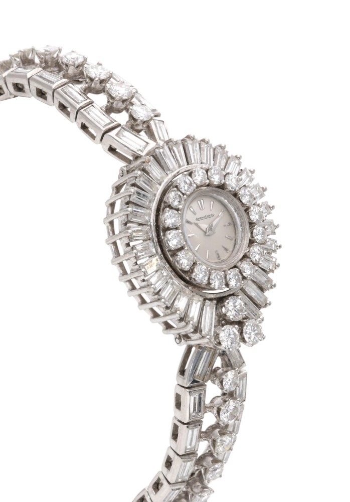 An elegant bracelet watch adorned with round brilliant-cut and baguette-cut diamonds weighing a total of approximately 13.00 carats. The watch is back winding with a caseback secured by lugs. The silver-tone dial is signed Jaeger-LeCoultre with applied silver-tone hour markers and watch hands. Completed by a box clasp.
