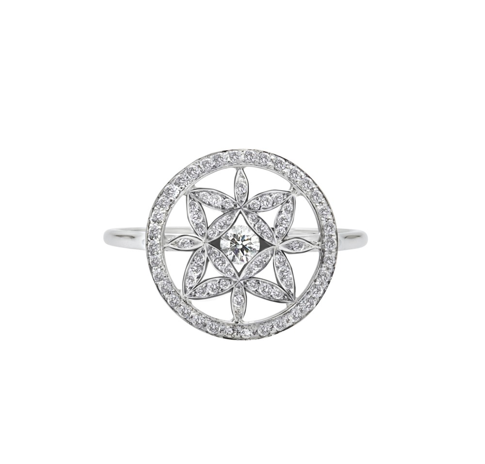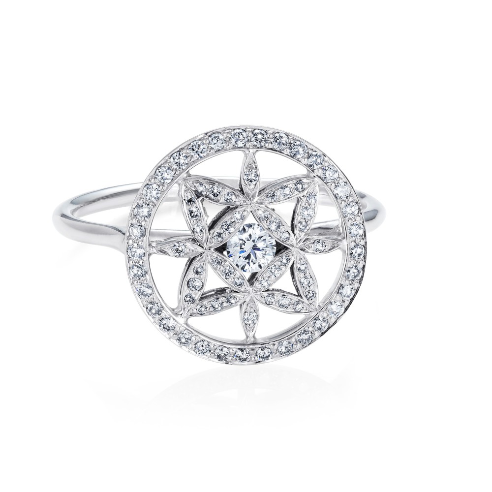 Composed of 76 round brilliant-cut diamonds arranged in an elegant floral pattern with surrounding halo.